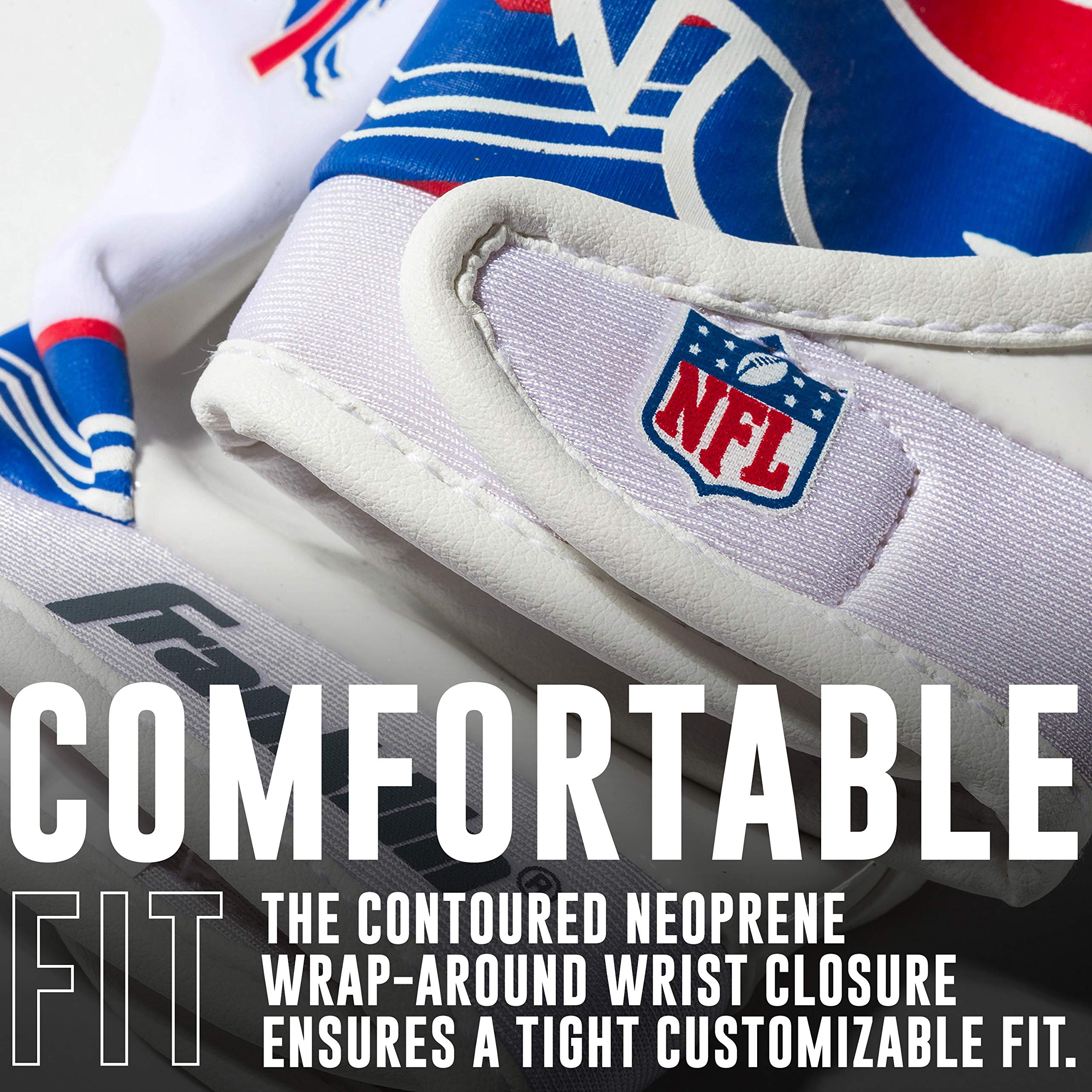 BUFFALO BILLS RECEIVER GLOVES: These official NFL youth receiver gloves are designed with authentic team logos and colors so kids can look and play like their favorite pros!
