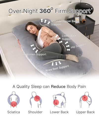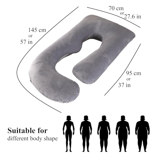 Shape and Sizes: The ALLOPERA full-body maternity pillow measures 57 inches (145 cm) in length, offering extensive support for the entire body. Its ergonomic design, combining both C shape and U shape, is tailored to provide 360-degree comfort, making it ideal for various sleeping positions, whether side sleeping, back sleeping, or when dealing with a growing belly. The pillow's generous size ensures that users, especially those in later stages of pregnancy, can enjoy relief from multiple body areas, including the back, hips, and legs.