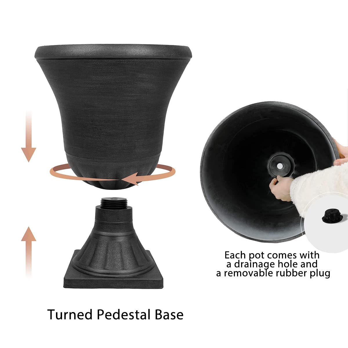 Optional Drainage System: These urn planter comes with a drill hole in the bottom to drain the stagnant water, also with a removable rubber plugs to store the water needed by your plants