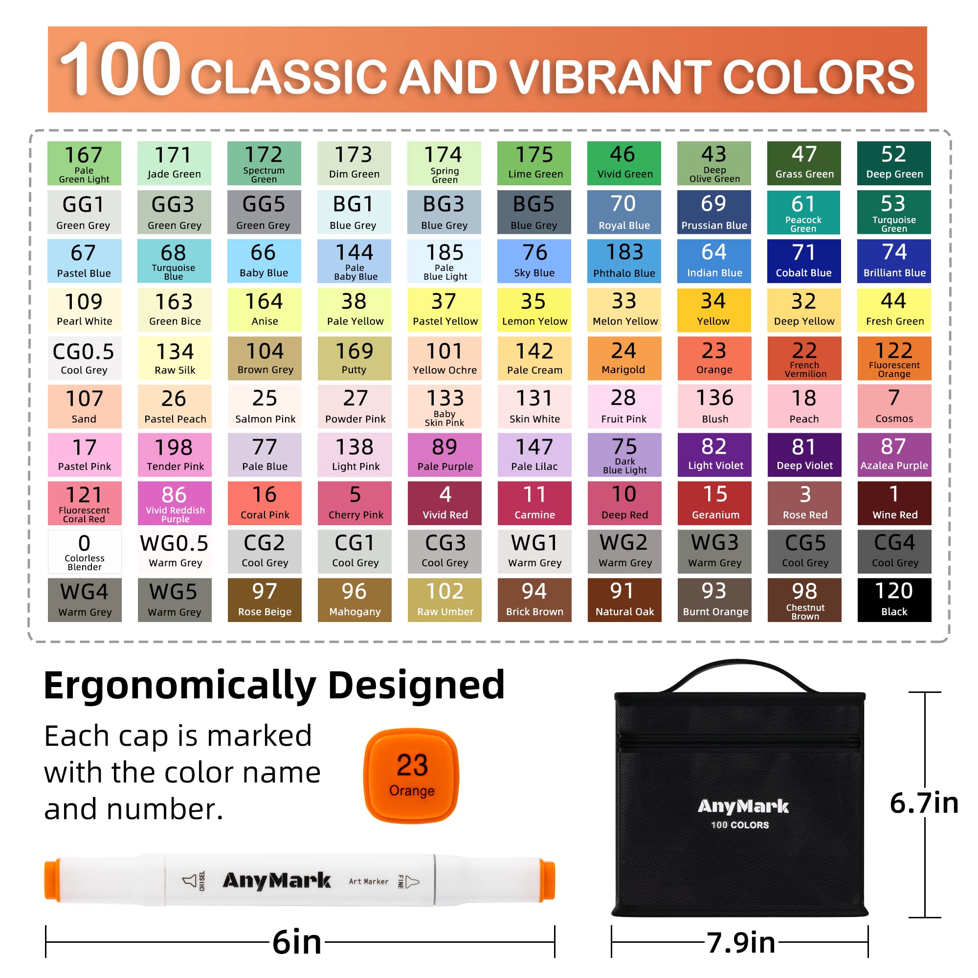 VIBRANT COLORS - AnyMark 100 colors alcohol markers bring your art to life,are recognized for their excellent coverage, blending ability, and diversity of colors. Unleash your inner artist with our premium markers today!