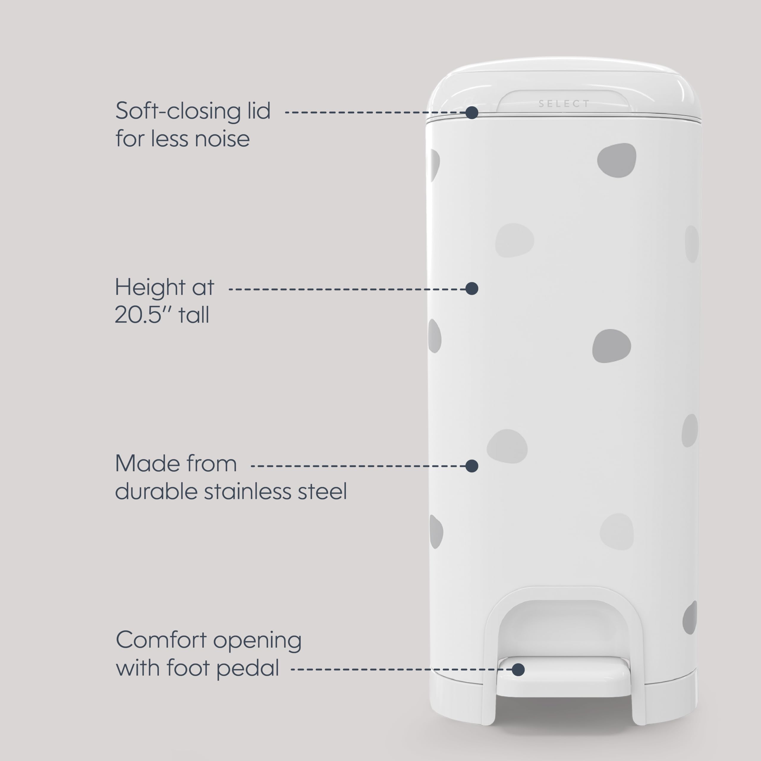 Introducing the new Diaper Genie Select Pail, a sleek addition to your nursery designed with both style and durability in mind. Crafted from durable stainless steel, the new Diaper Genie Select pail features a Push N Lock odor locking clamp that effectively helps to contain odors of messy diapers. For added convenience, the Select diaper disposal system includes a foot pedal, allowing for easy, one-handed operation. Our new metal pail can hold up to 40 newborn diapers and comes with multi-layer starter refill film, featuring our advanced Max Odor Lock technology. This starter refill can securely hold up to 165 newborn diapers, offering extended usability. The Select Pail is also compatible with our Diaper Genie Jumbo refills made from a durable, multi-layer film with odor-locking barrier technology, ensuring effectiveness and long-lasting freshness.