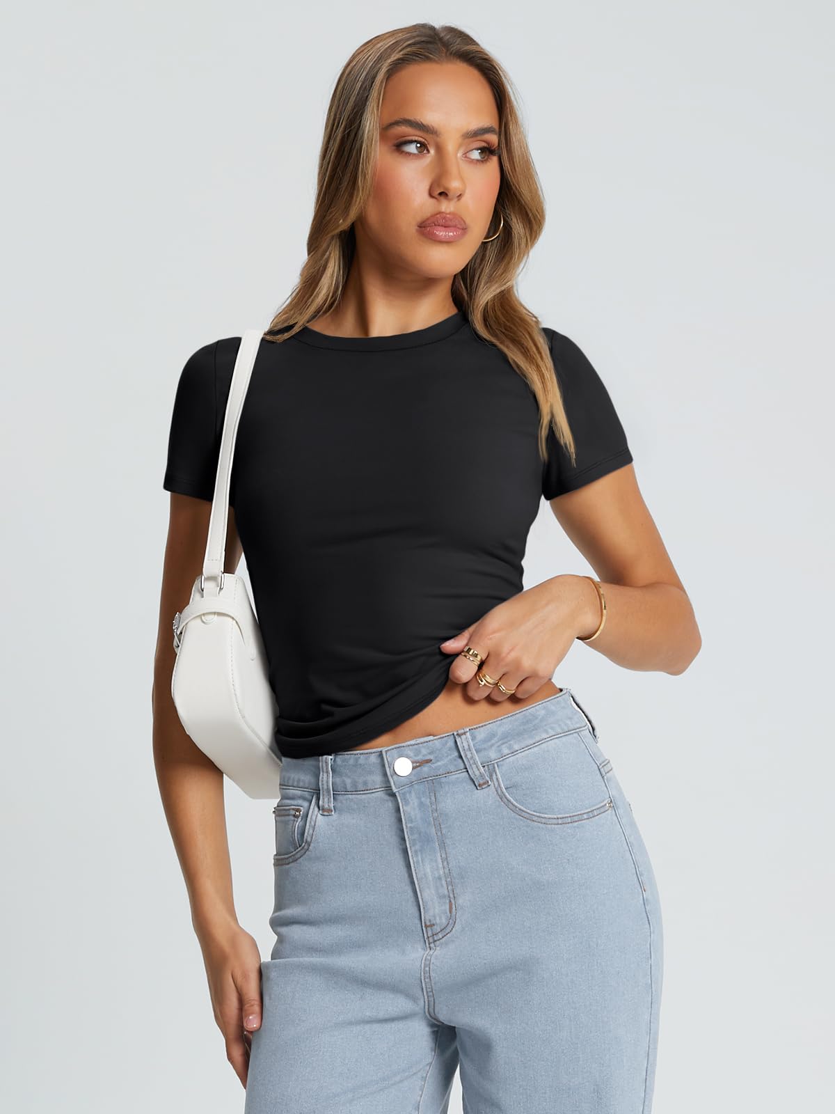 Design: This top features a cute, slim-fitted, and casual style with a crew neck and short sleeves. It comes in both cropped and regular styles, giving you the option to wear it as a regular top or fold it up for a trendy crop top look