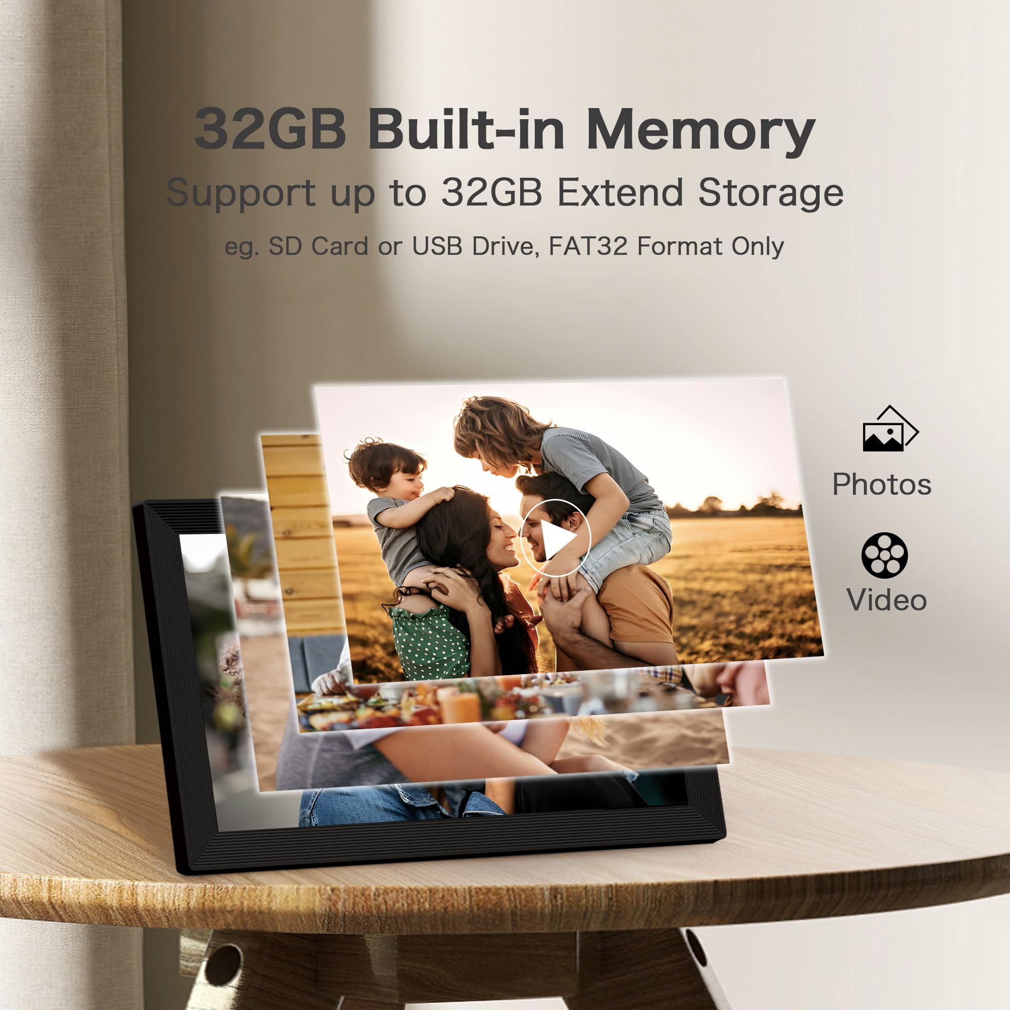 Instant Share via Frameo APP; Connect your frame to WIFI, and share photos and videos(Max.15s) quickly via a reliable App - Frameo to our electronic photo frame from anywhere, privately and safely, no member numbers limited. For those who already have a Frameo digital frame, no need to download another app. It has 32GB built-in memory and support up to 32GB external storage, enables you to share 50,000+ photos. Also, you can transfer via external storage or through a computer, no Wi-Fi needed