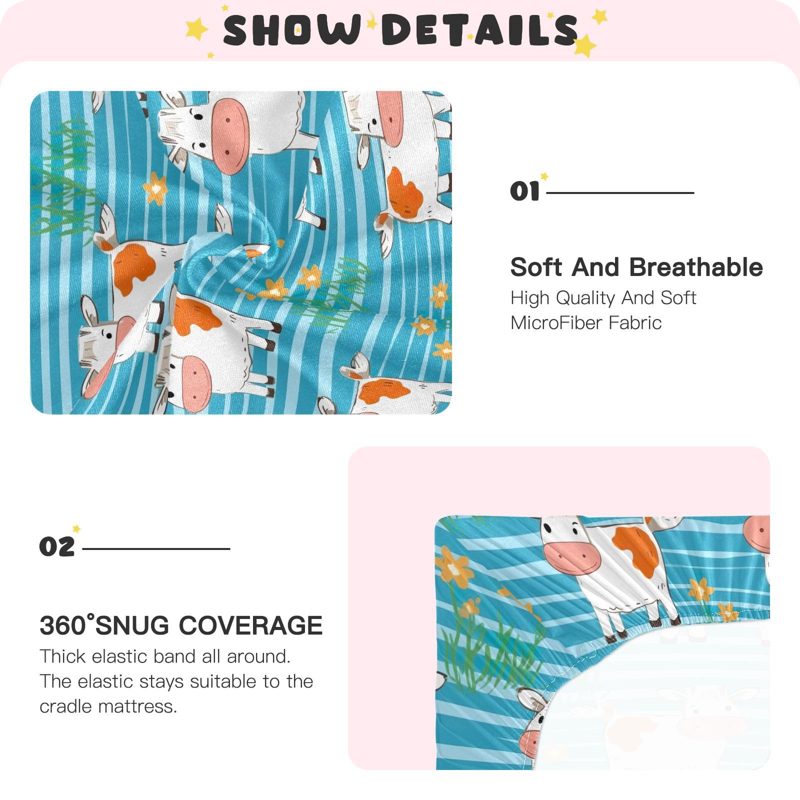 š¼ćBreathable MaterialćUMIRIKO Baby Crib Sheets made of soft microfiber,which is comfortable, breathable and skin-friendly.