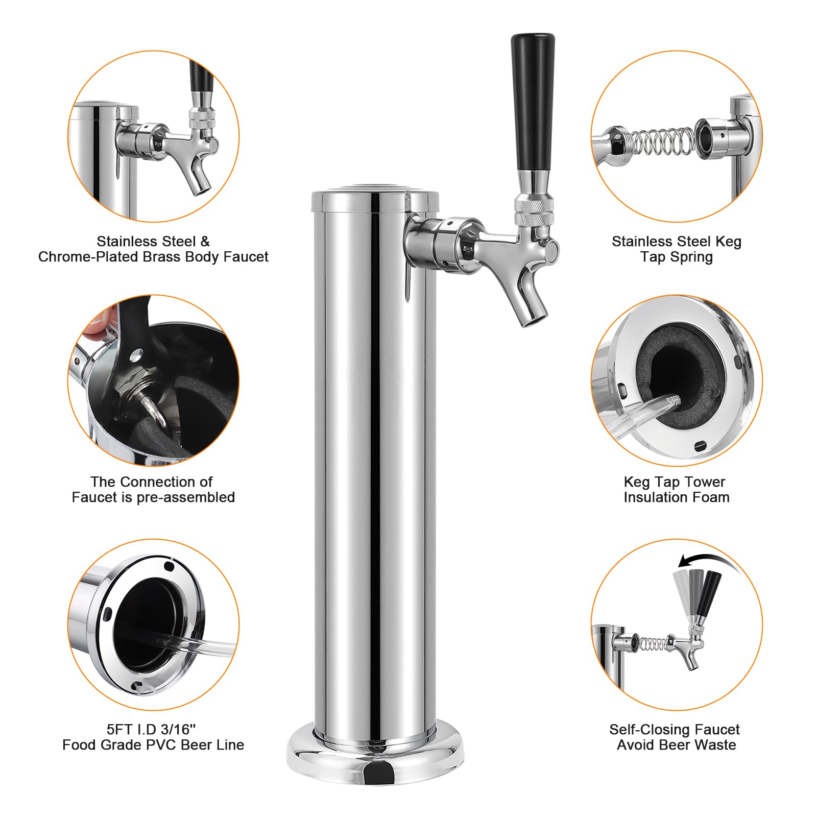 HEALTHY AND DURABLE: The beer tower dispenser is made of stainless steel, with the faucet body crafted from chrome-plated polished brass, and the internal core is stainless steel, offering corrosion resistance and easy cleaning. The food-grade PVC beer line preserves the original flavor of the beer, being strong and durable for long-lasting use