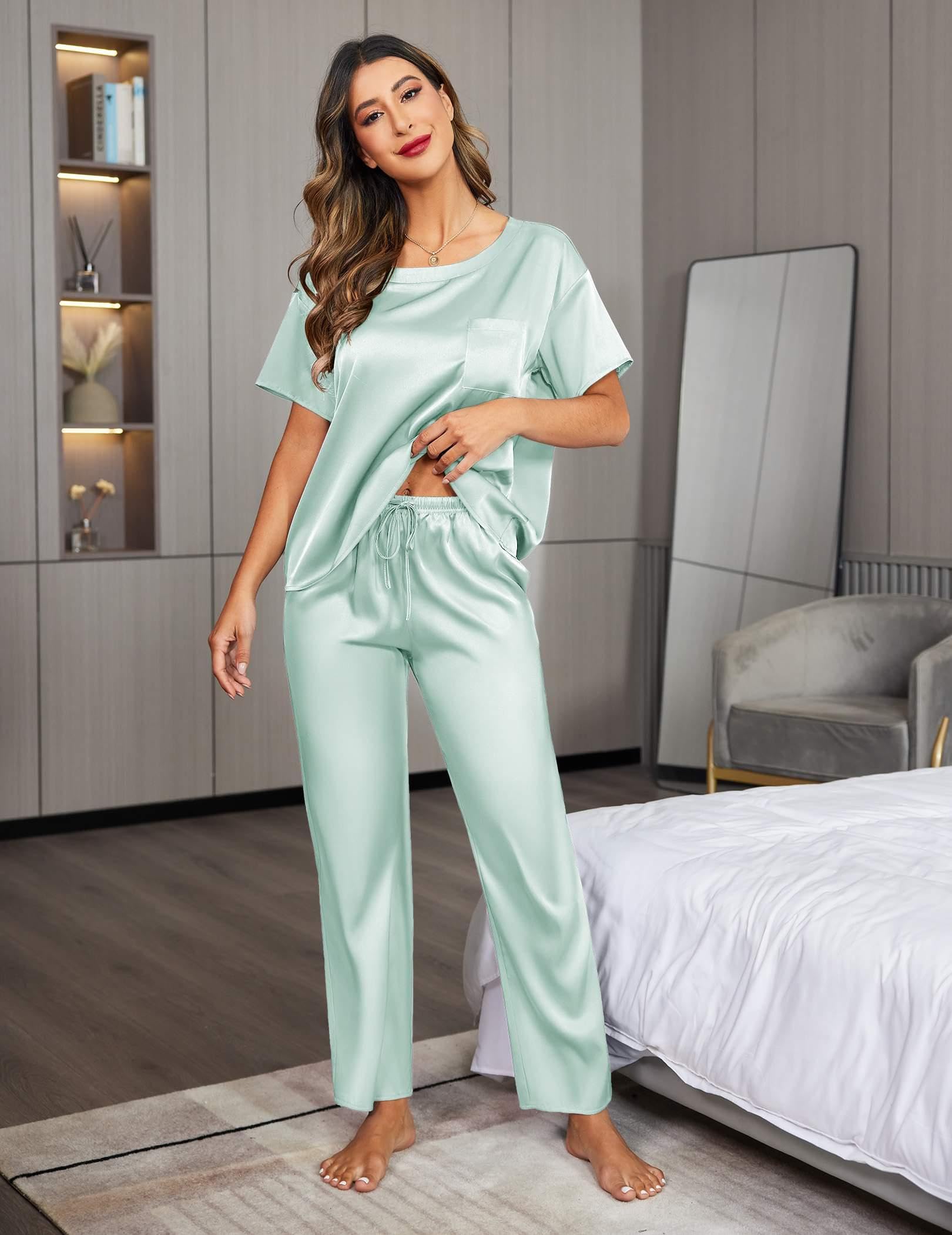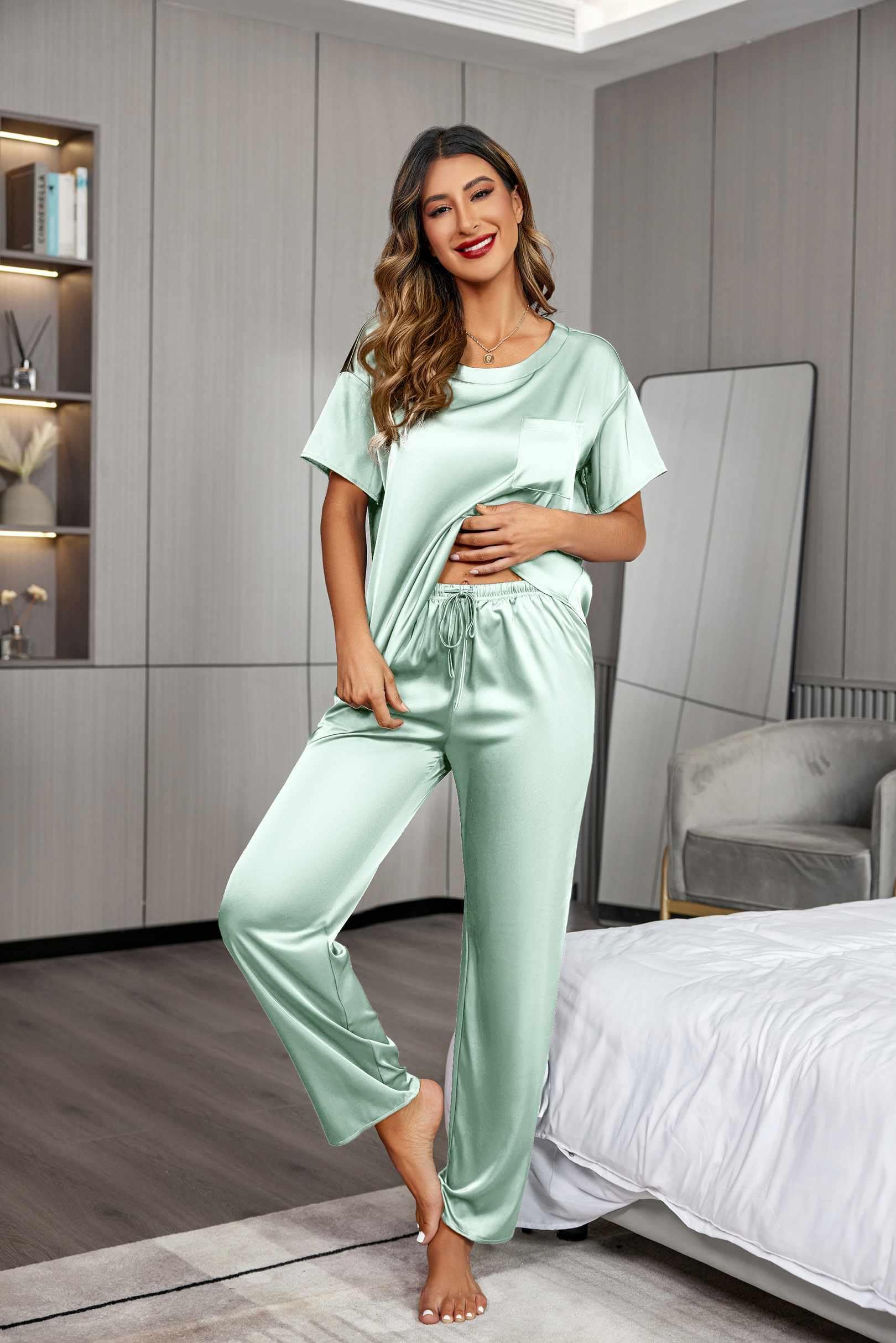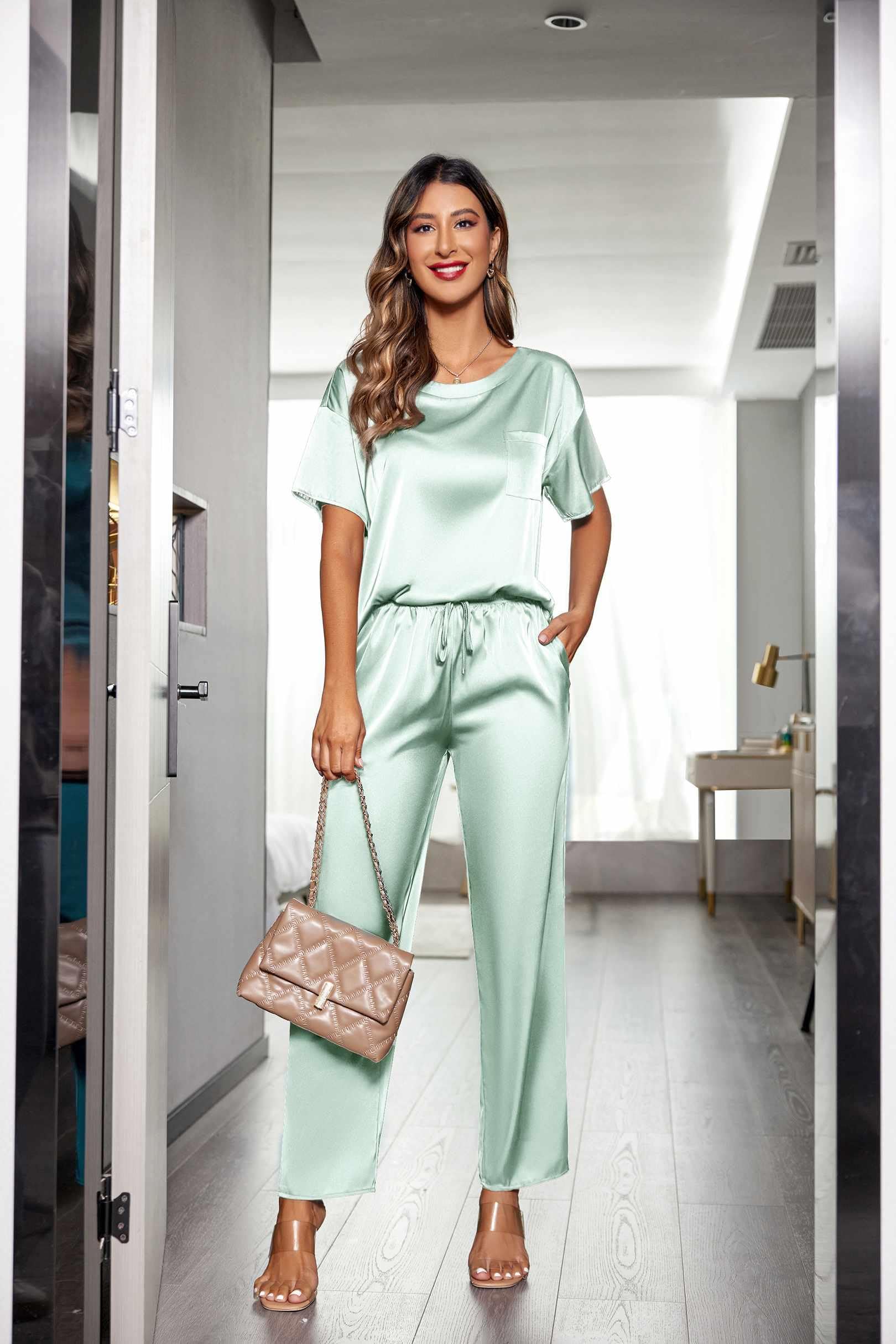 A lightweight two-piece pajama set featuring a pullover tee top and long pants. Soft satin silky fabric, comfy to wear.