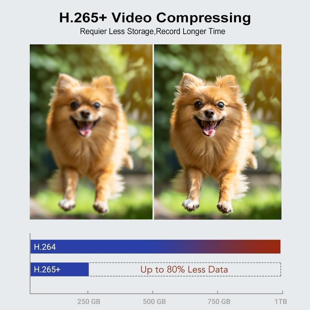 【H.265】H.265 coding offers longer recording time before having to overwrite the older recordings, saving up to 60% of storage space than H.264 systems. Same size hard drive record longer time.