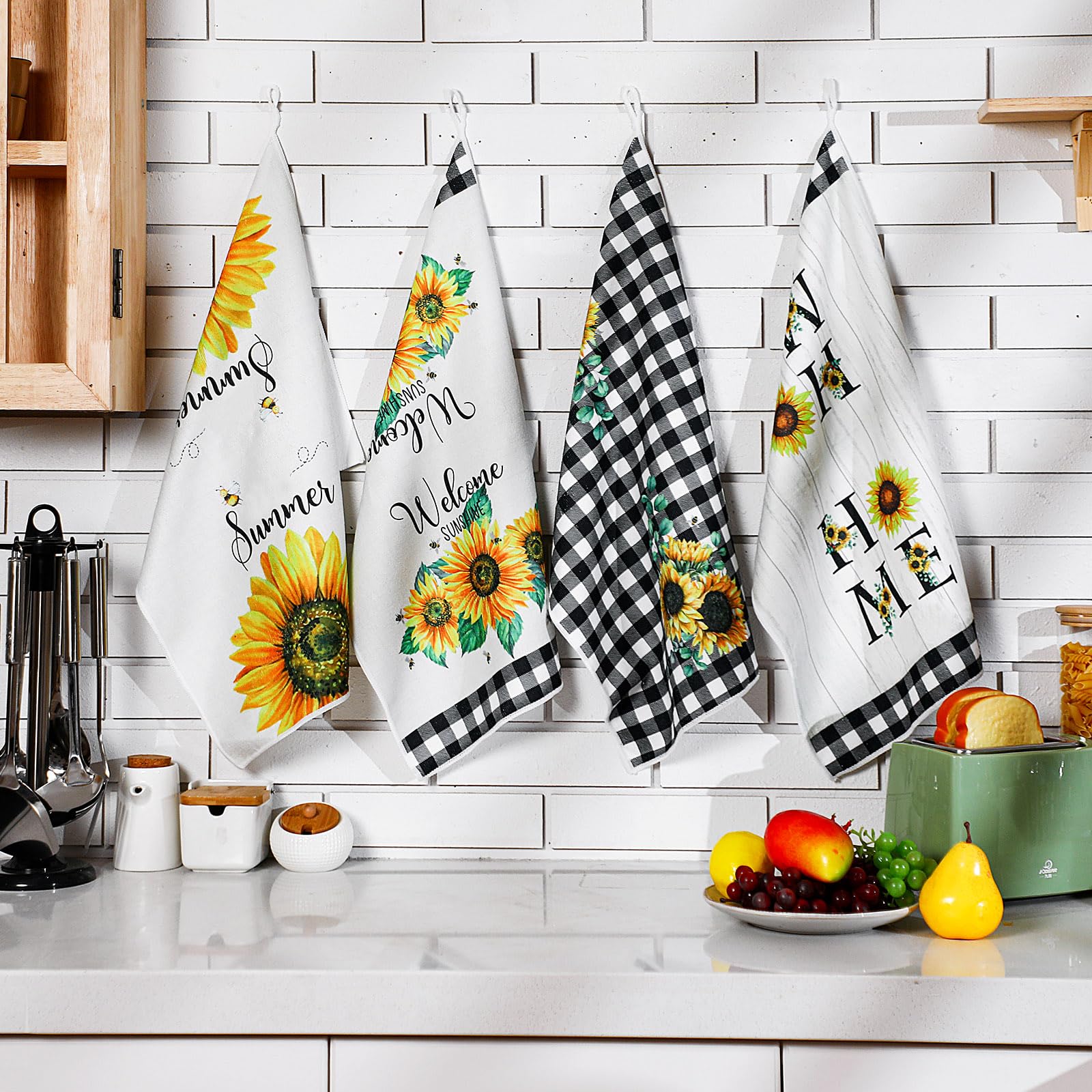 Sunflower theme design: Each kitchen towel is printed with sunflowers, bees, black and white plaid patterns, which are exquisite and cute, elegant and fashionable, and the main yellow, white, black and green colors create a fresh and comfortable seasonal atmosphere, adding bright colors to your home and kitchen