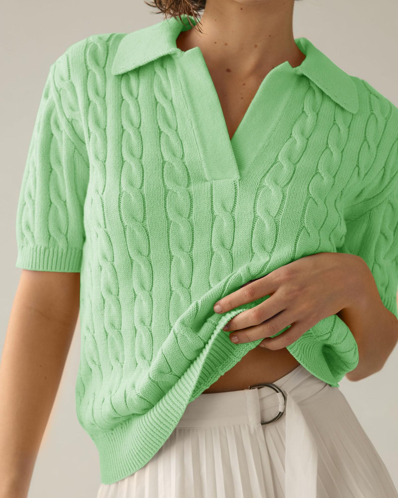 Features: Women's Cable Shirt, Short Sleeves, Slim V Neck, Small Lapels, Elasticized Ribbed Cuffs and Hem, Knit, Basic Solid Color, Loose Fit, Casual Style. Comfortable women's soft summer top.