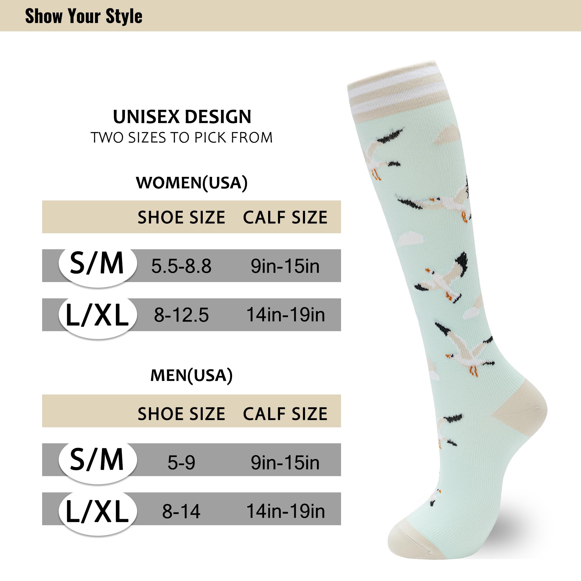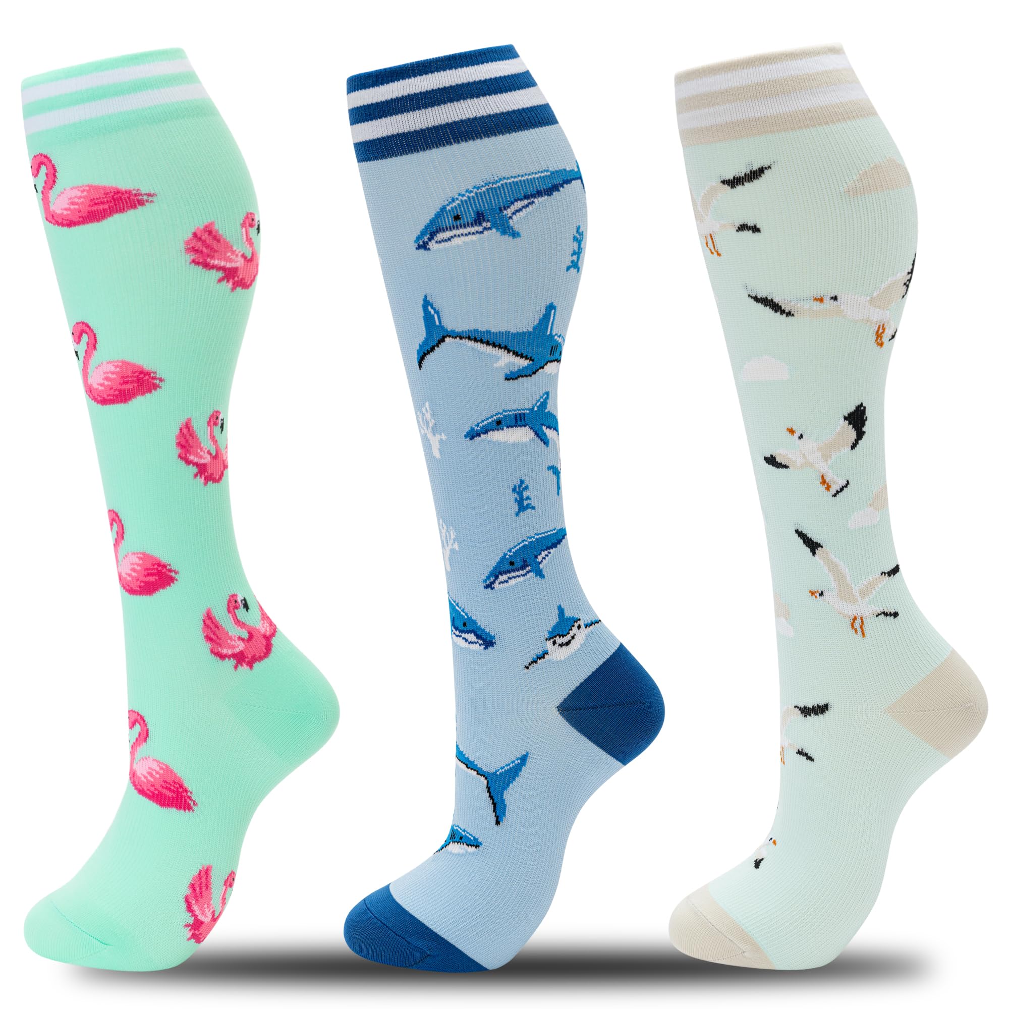 STYLISH COMFORT DESIGN We have prepared compression stockings for women with different cute animal prints for you. Brightly colored compression socks are with a unique pattern and reinforced toe and heel sections for added support and comfort. Just pick your favorite from these fun compression socks to show your personality and style