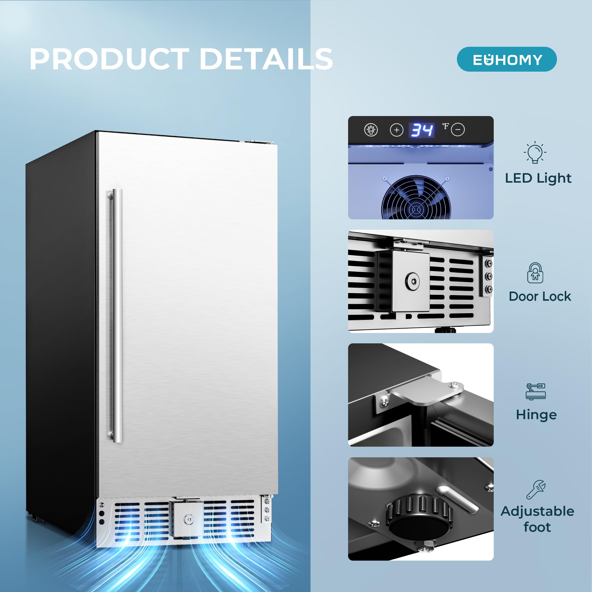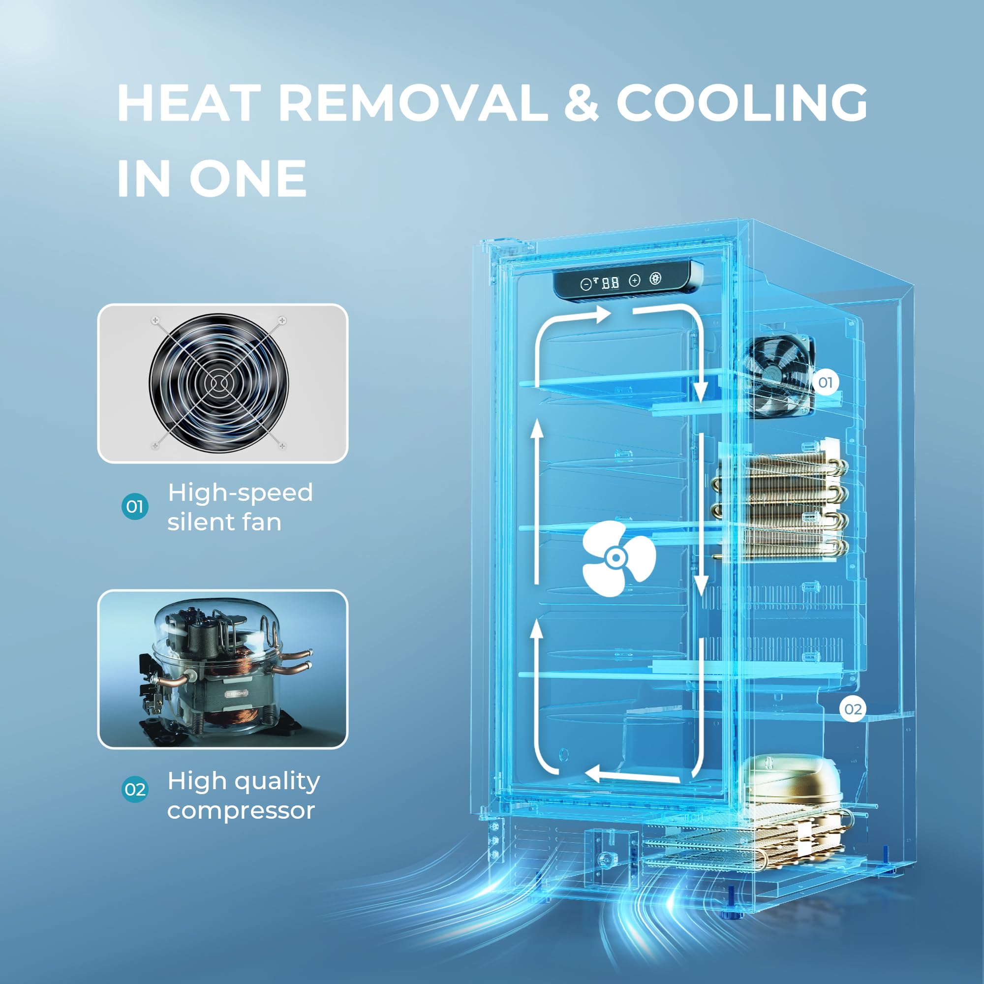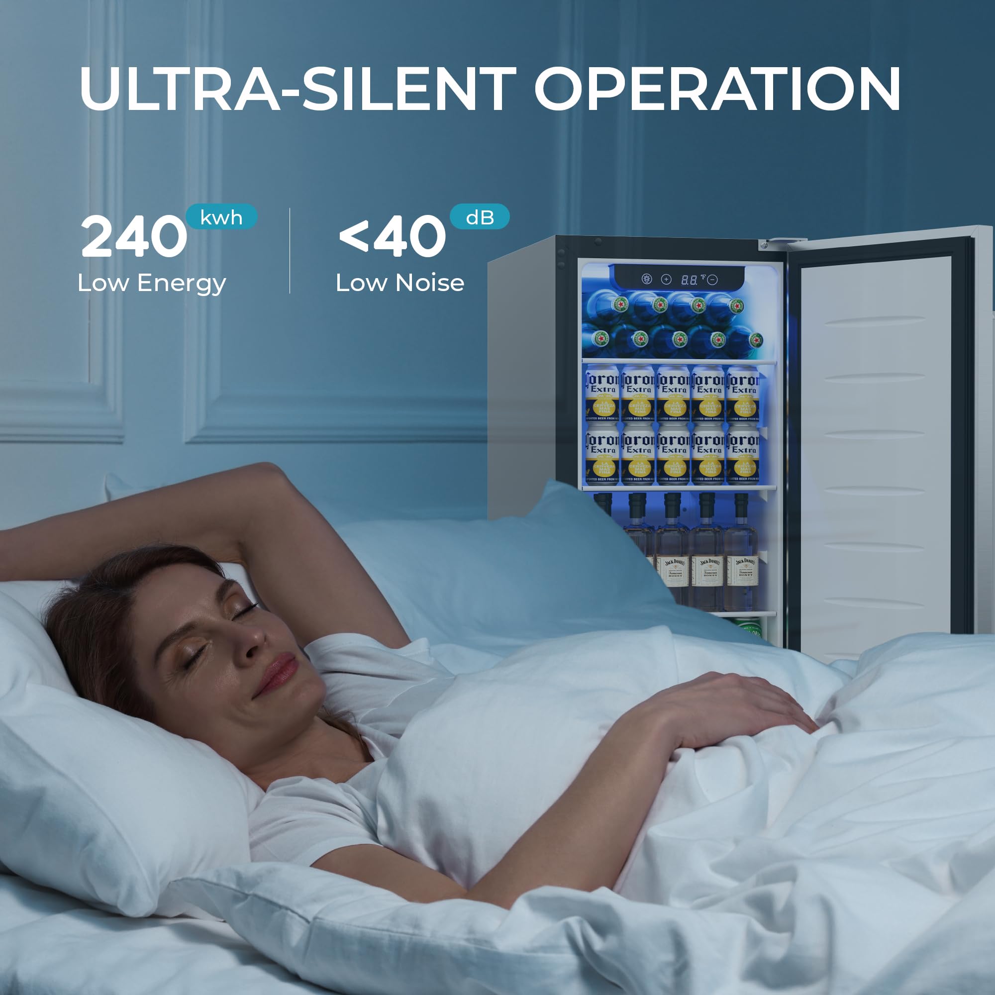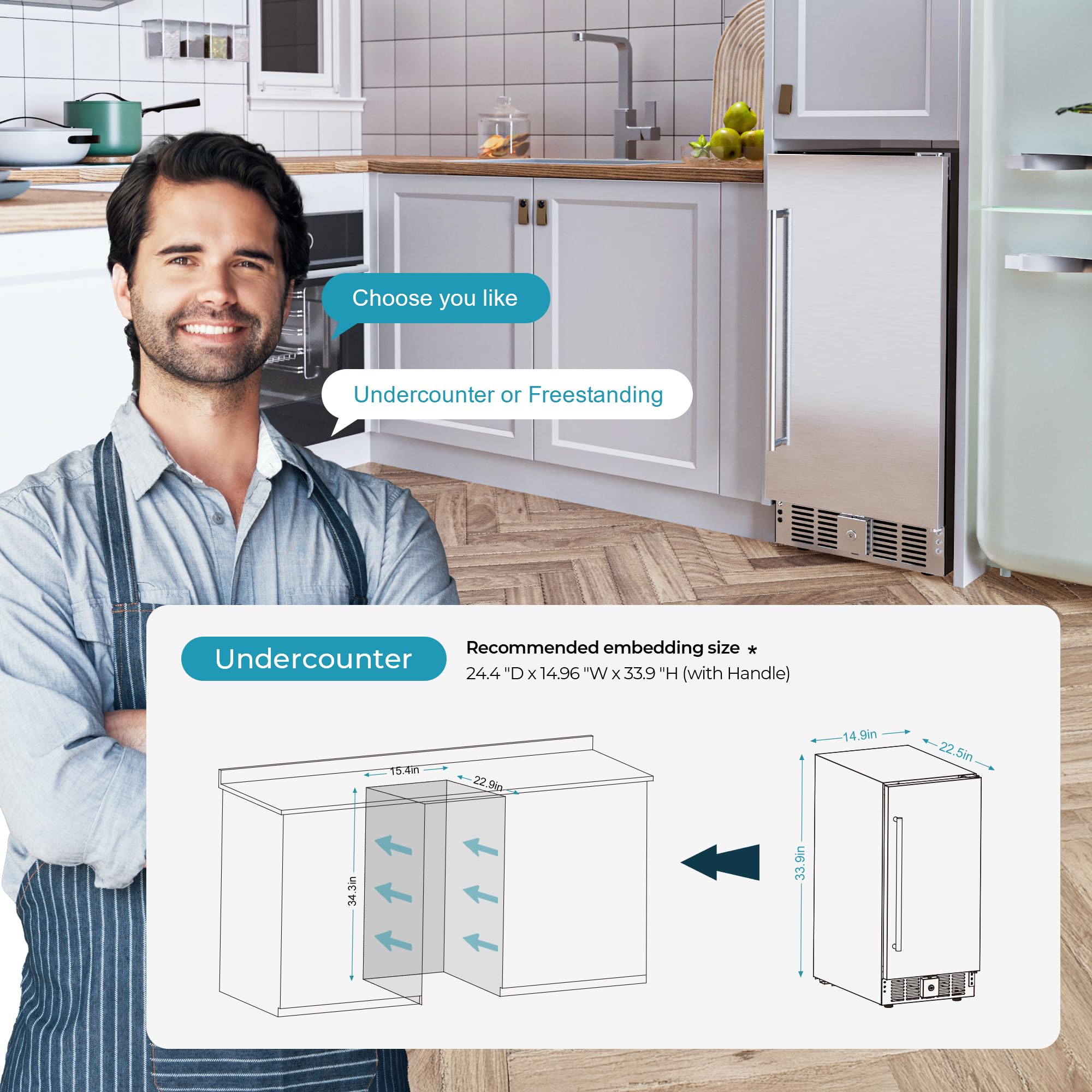 Superior cooling capacity - This beverage refrigerator (33.9x14.9x22.5 inches) features front ventilation for optimal airflow, enabling under-counter installation.The under counter fridge utilizes an enhanced cooling system with quiet fan circulation and low-vibration compressor (<40dB) to maintain precise temperature control for wines and beverages.