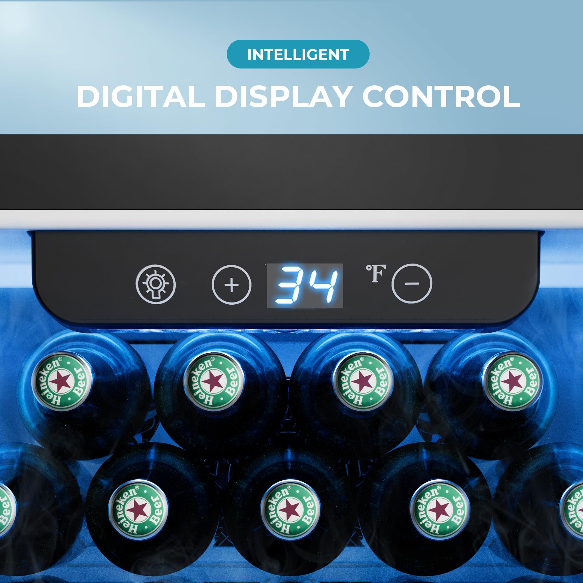 One-touch temperature control - This under counter refrigerator features intuitive Digital display panel controls with one-touch temperature adjustment (32-50°F) for precise beverage cooling. The beverage cooler's energy-efficient LED lighting ensures clear visibility in low-light settings while maintaining a sleek profile.