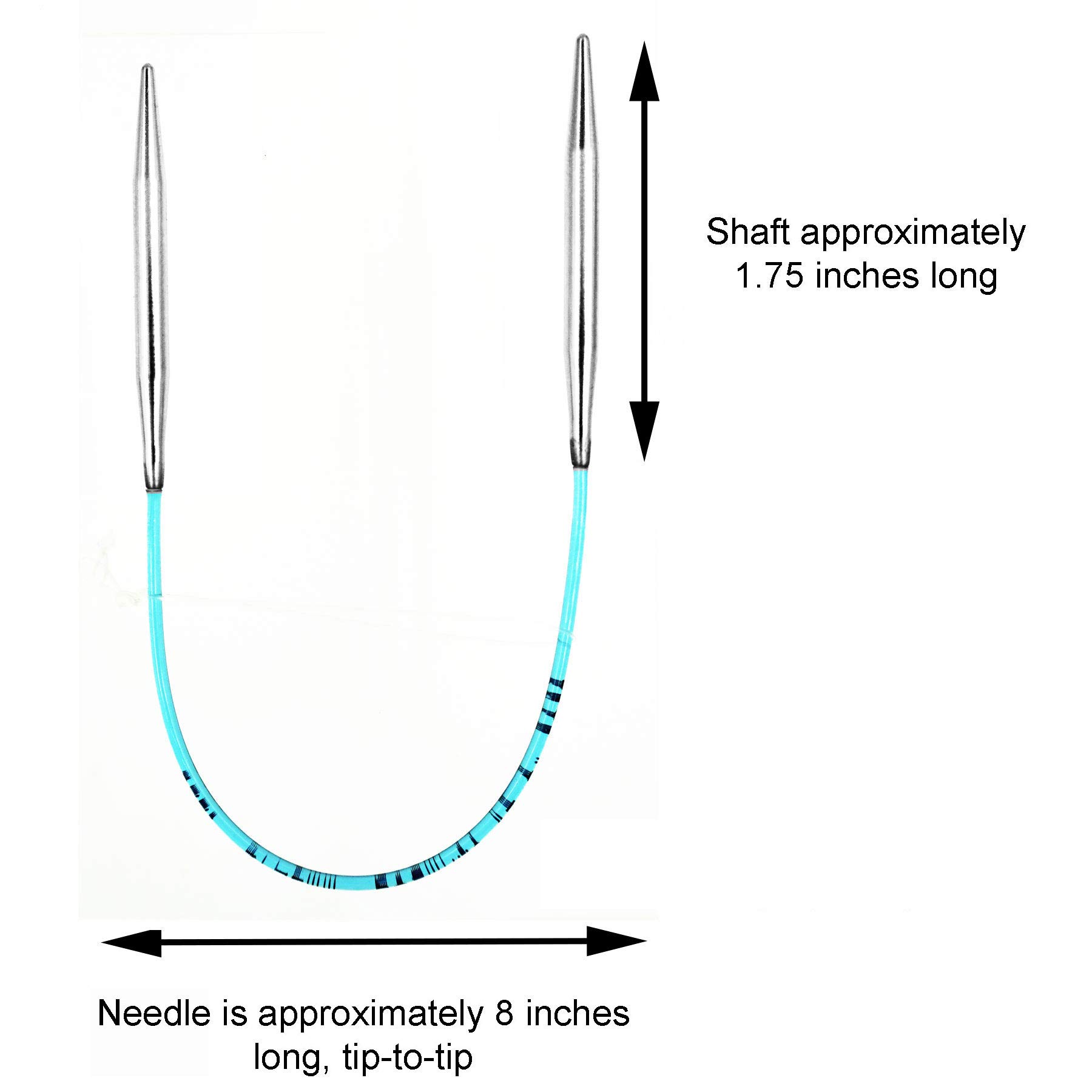 Includes 1 addi Knitting Needle Turbo Circular White-Bronze Blue Cord 8 inch (20cm) Size US 02 (3.0mm) and 10 Stitch Markers; each locking stitch marker measures approximately .9" x .5" closed and comes in fun and bright assorted colors