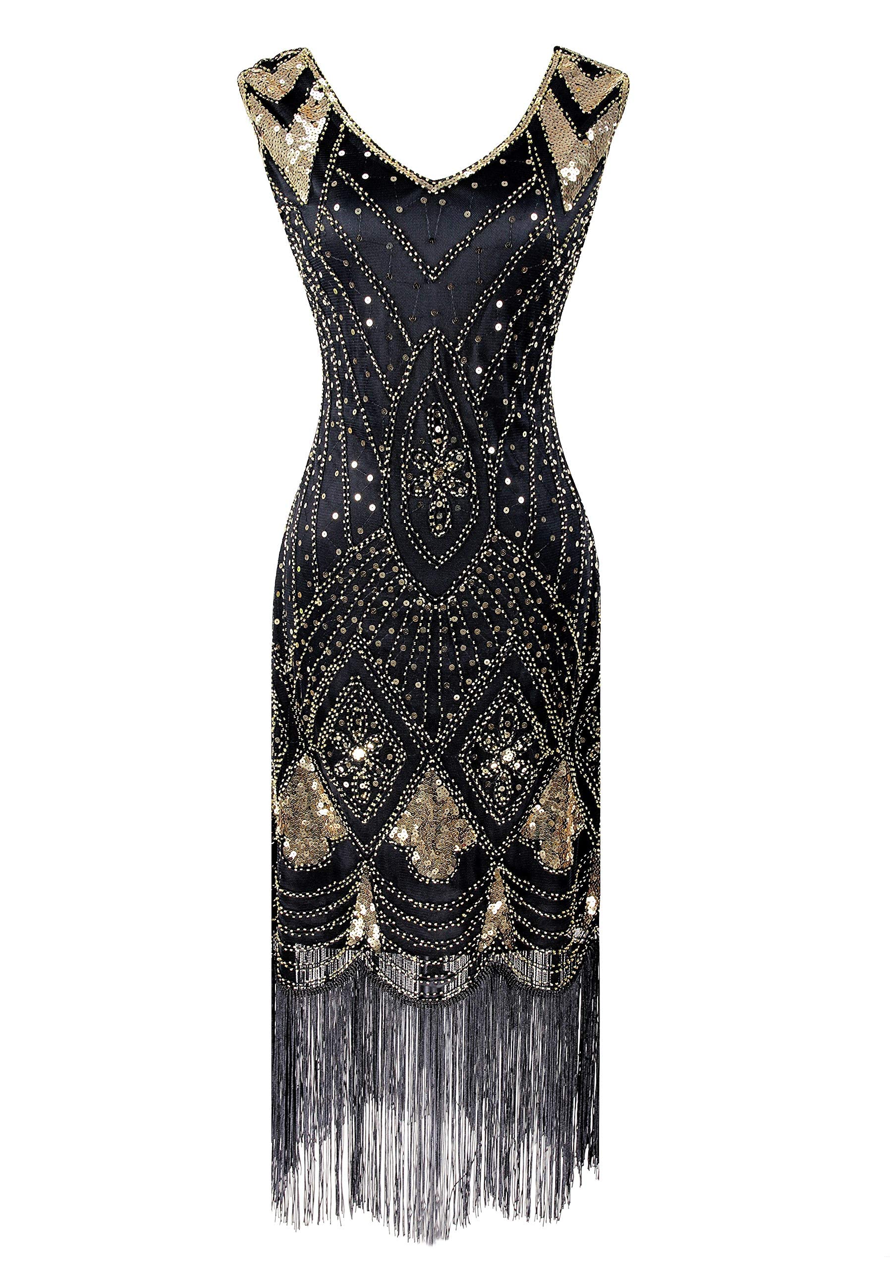 Package include: 1 x 1920S Sequin Tassel Flapper Dress , 2 x Pearl Necklace ; 1 x Long Satin Gloves; 1 x Black Cigarette Holder ; 1 x Headband ; 2 x Earrings ; 1 x Pearl Bracelet ; 1 X Pearl Brooch ; 1 x Pearl Open Ring.