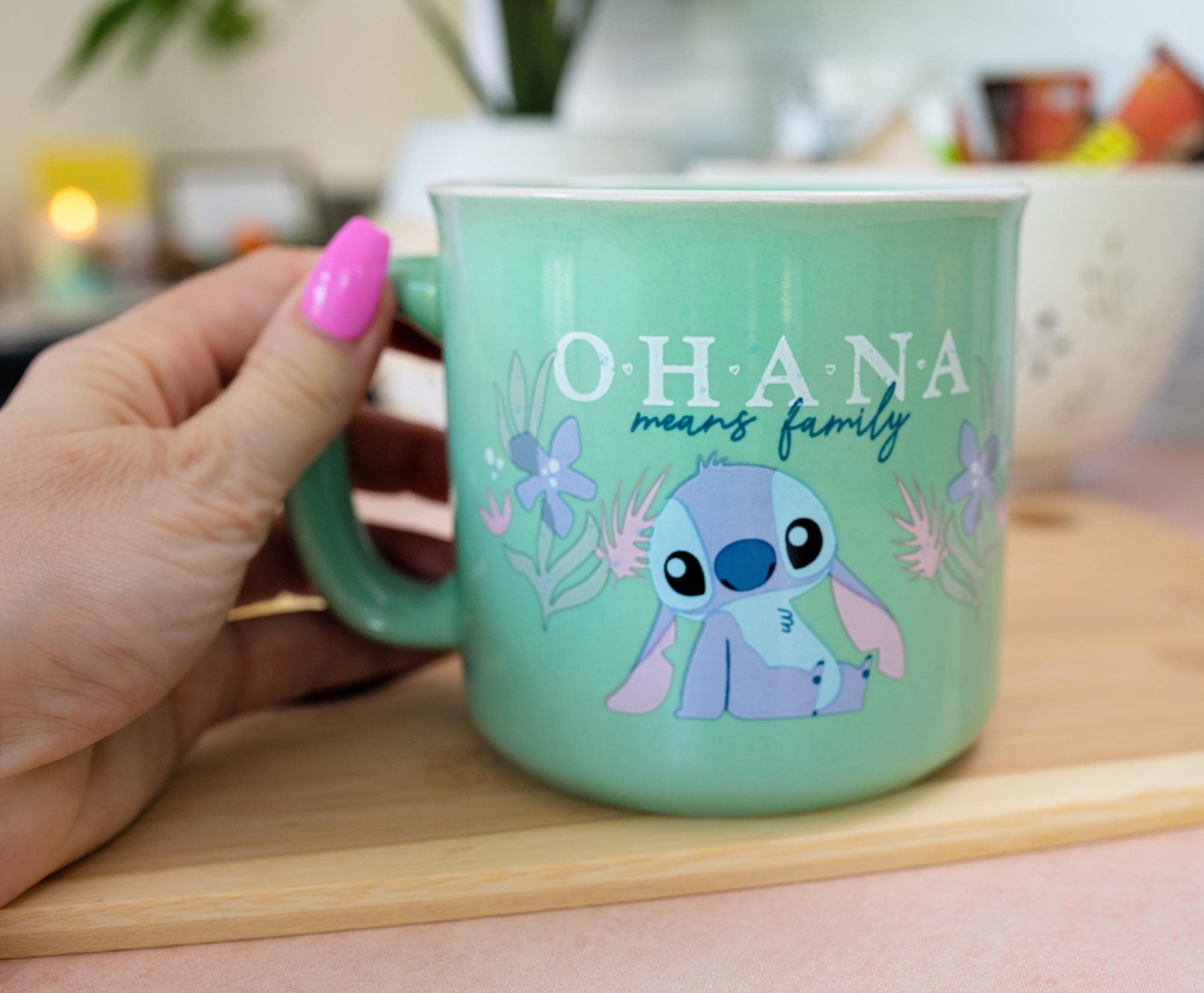 CAMPER MUG: Enjoy your morning coffee or tea in this adorable Lilo & Stitch 20oz. Ceramic Camper Mug. Featuring Stitch surrounded by pretty flowers and "Ohana means Family" against a light blue background with a white rim