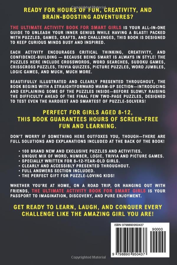Unleash Your Creativity, Smarts, and Inner Genius! The Ultimate Activity Book for Smart Girls is packed with endless fun, brain-boosting challenges, and creative activities designed just for tween girls. Perfect for curious minds, this book is the ultimate way to stay engaged, entertained, and inspired—whether at home, on the go, or with friends. Inside, you’ll find a variety of activities, from puzzles for girls and brain games to crafts for 8–12 girls, all designed to build critical thinking, creativity, and confidence. From sudoku to word searches, trivia to picture puzzles, every page is bursting with excitement. Beautifully illustrated and easy to follow, this girls activity book for ages 8–12 starts with simple challenges and gradually increases in difficulty, leading to two-page brain teasers that will test even the sharpest young minds. And if you get stumped, full solutions are included at the back. Why This Book is Perfect for Tween Girls: 100 exclusive puzzles and activities. A unique mix of word games, number challenges, logic puzzles, trivia, and crafts. Specially crafted for girls ages 8–12, blending fun and learning perfectly. Easy-to-follow layouts and delightful illustrations throughout. Full answers and explanations included for every challenge. Whether you’re looking for girl activities to enjoy solo, with friends, or on a road trip, this book guarantees hours of screen-free fun. Get your copy now and inspire the amazing girl in your life to think big, dream bold, and have fun!