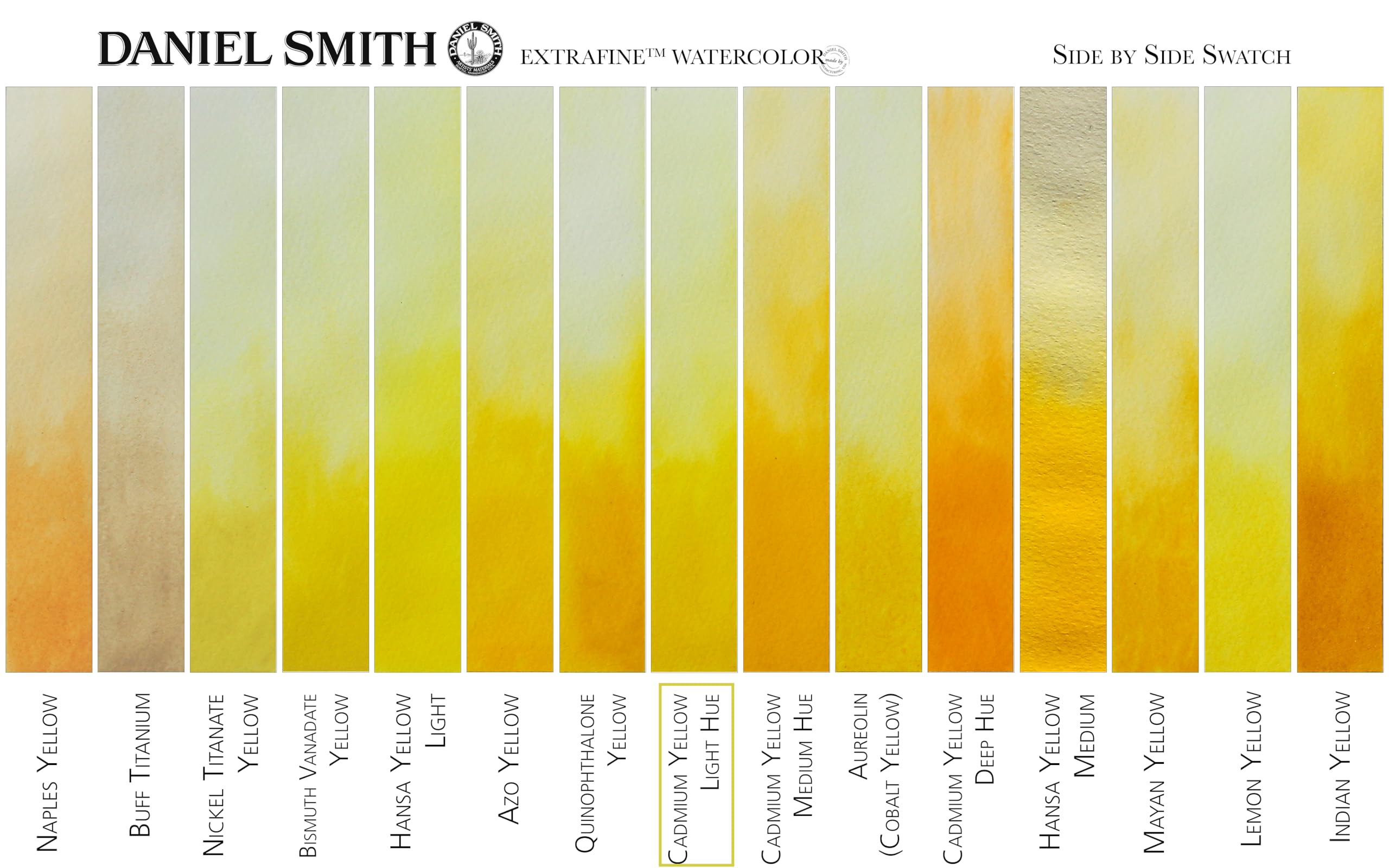 Cadmium Yellow Light Hue is a clean lemon yellow, create fiery oranges by mixing with Opera Pink or remarkable granulating greens with Cobalt Teal Blue. We've done it! Safe, Vibrant Cadmium Hue Watercolors! Our new formulas provide all the density and richness of classic cadmium colors. Our hues are virtually identical in color to their namesakes, but cleaner in mixtures and stronger in tints - you'll find a little goes a long way. Working properties - staining power, semi-transparency and excellent light fastness - are also nearly identical to those of the low-soluble cadmium colors we previously offered.