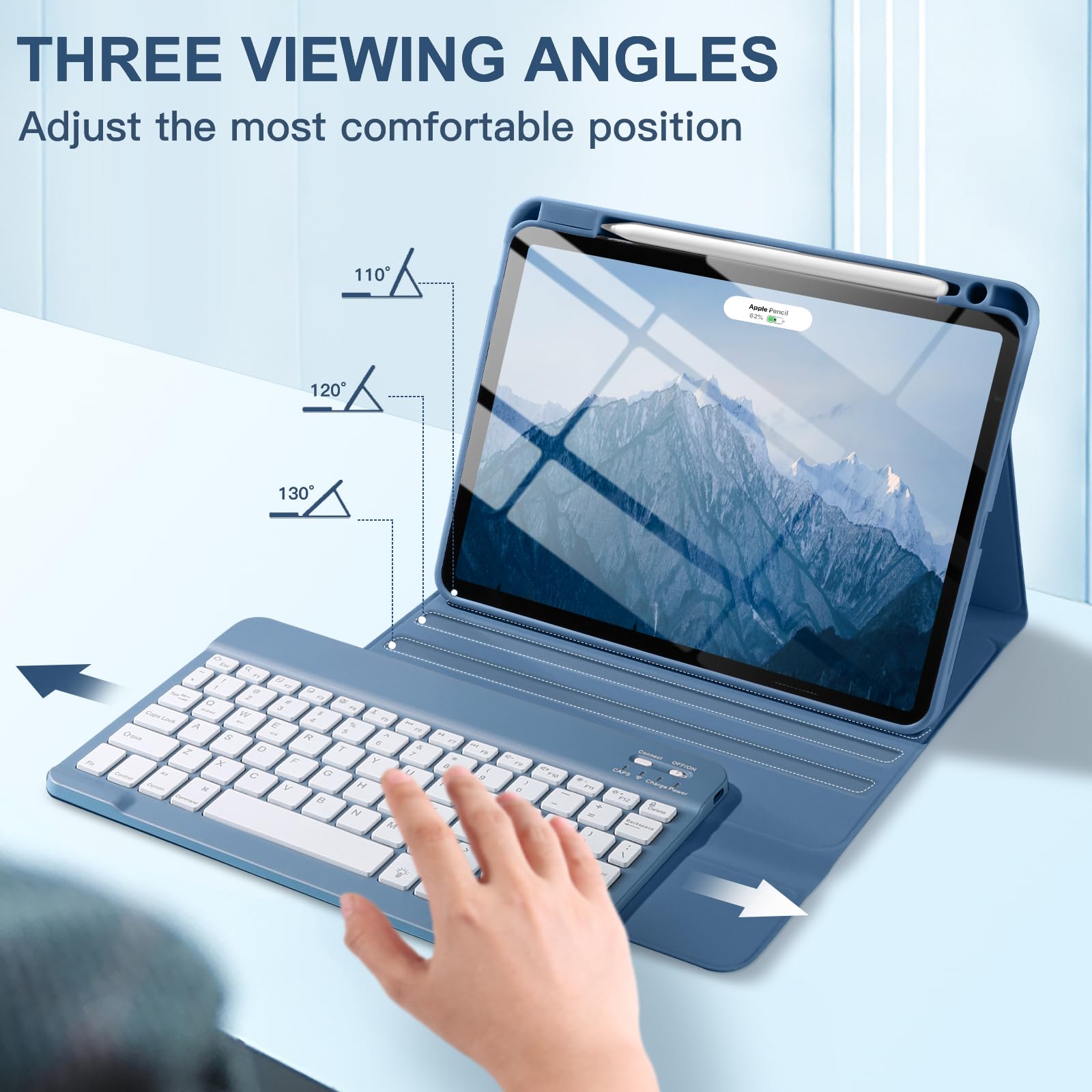 ❤【Adjustable Viewing Angle】There are 3 anti-slip grooves design inisde of the case for iPad air keyboard case provides the perfect stand angle. which you can change where the tablet is on the case and adjust the screen angle this way for drawing or writing on, browse the web or do more
