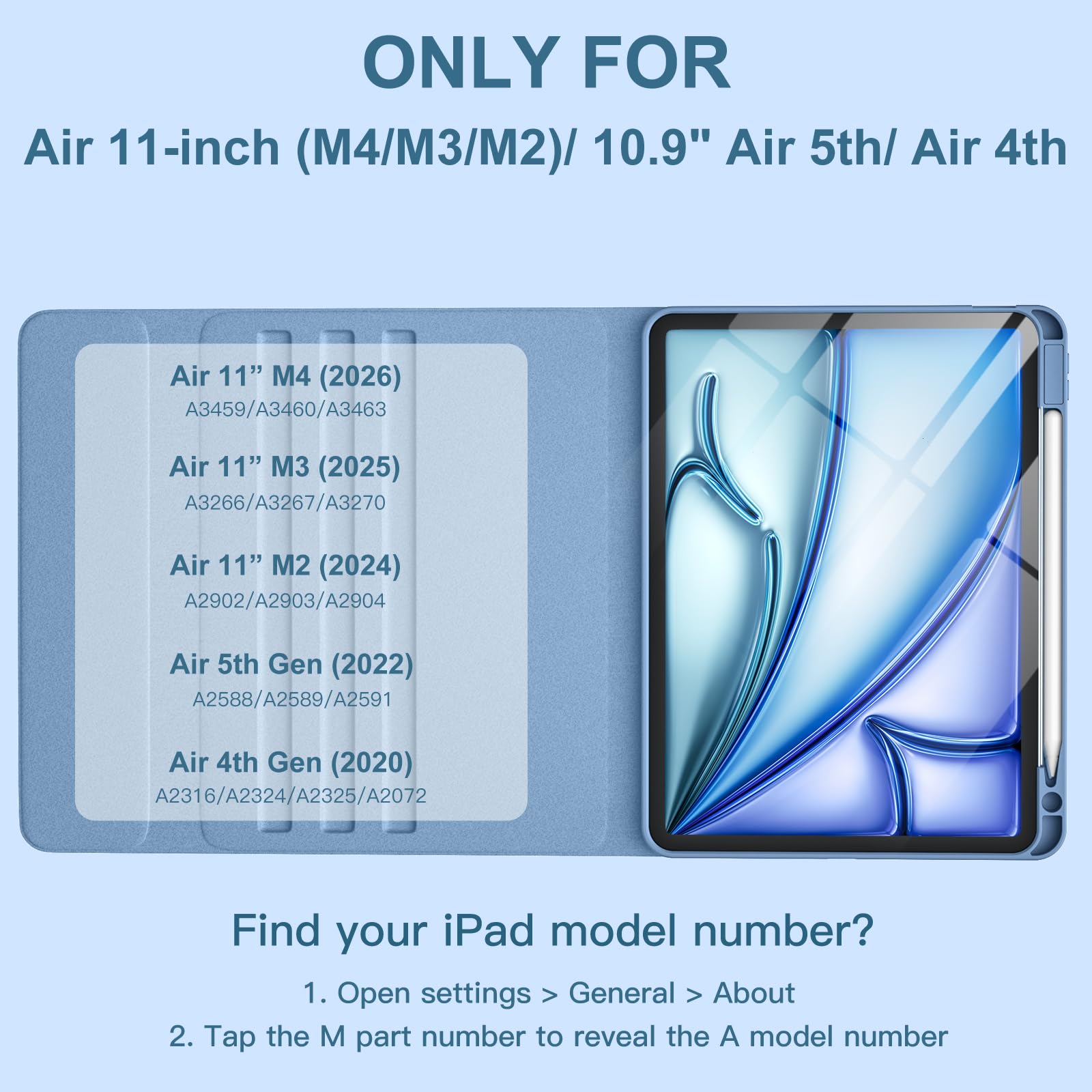 ❤【Compatibility】This air keyboard case is compatible for iPad Air 11-inch M4 2026 (Model Number: A3459/A3460/A3463), for iPad Air 11-inch (M3) 2025 (Model Number: A2902/AA2903/A2904), for iPad Air 11-inch (M2) 2024 (Model Number: A3266/A3267/A3270), for iPad Air 5th Generation (Model Number: A2588/A2589/A2591), for iPad Air 4th Generation 10.9 inch (Model Number: A2316/A2324/A2325/A2072). Not for other devices. Please be kindly check the model number No. starting with the letter "A" of your tablet back before order