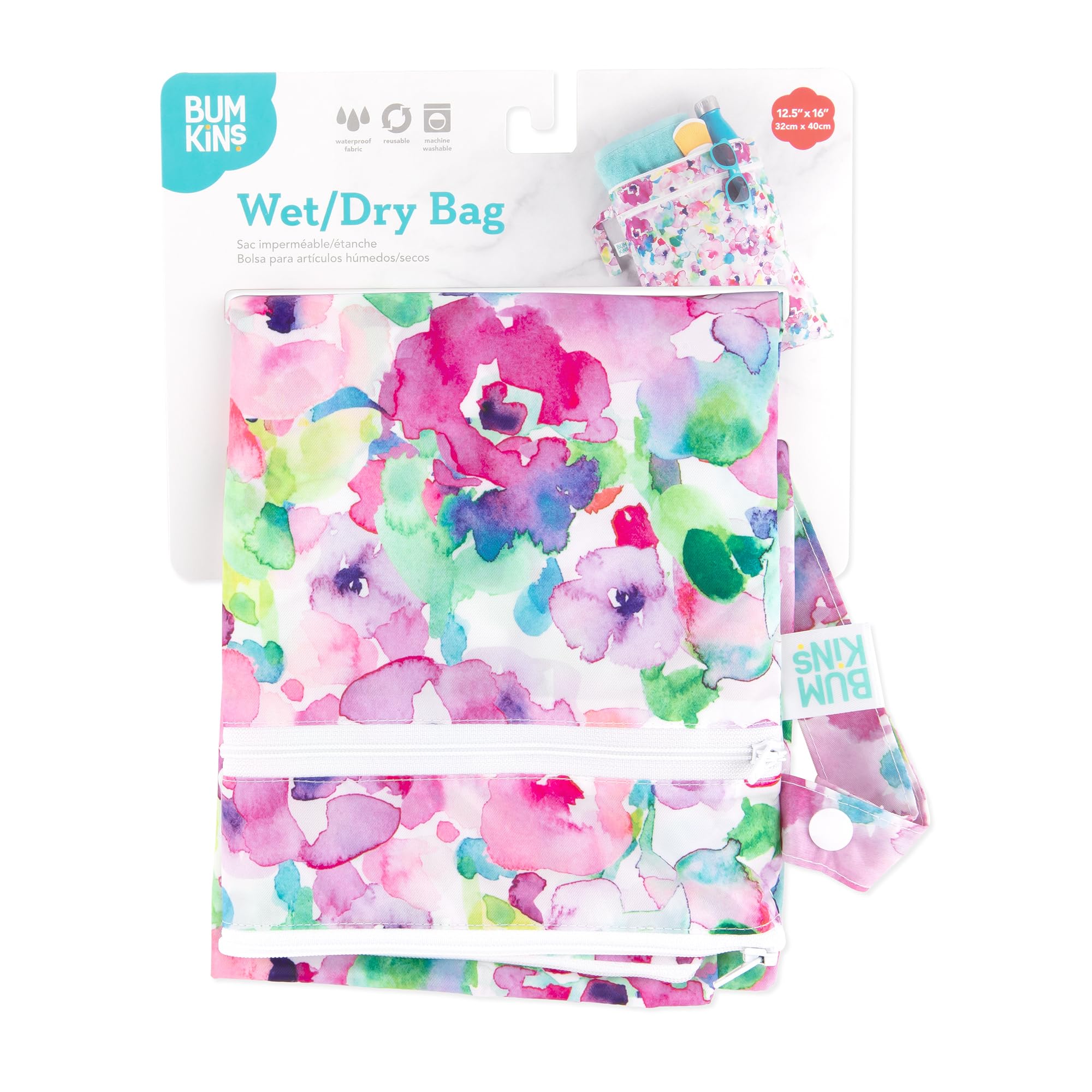 The better alternative to single-use plastic bags, our reusable Wet / Dry Bags are made from Bumkins’ signature waterproof fabric – 100% polyester embedded with TPU. Our bags feature heat-sealed seams for true waterproof protection. Two compartments with smooth zippered closures keep wet and dry items separate. Wet / Dry bags are great for carrying diapers, dirty gym clothes, shoes and wet swimsuits. These bags make excellent organizers for toys, accessories, toiletries, electronics, travel and more. With a snap handle, snap your bag wherever you need it - stroller, changing table or suitcase. Bags are non-gusseted, non-insulated and non-stretch. Measures 12"x16". Fits approximately 6 cloth diapers. Designed in Arizona, responsibly made in China.