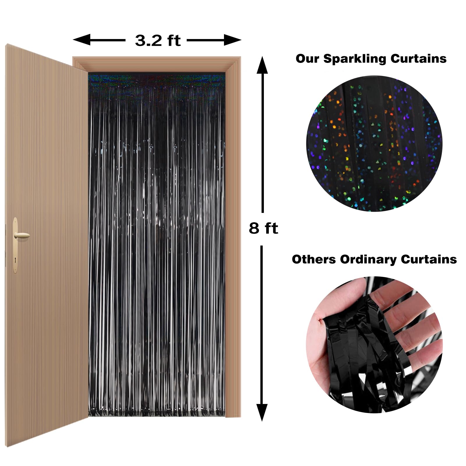 The size of each metallic tinsel foil fringe curtain is 3.2 feet wide and 8 feet long, Package include 2 pack black foil fringe curtains, suitable for hanging on a door or coverage a wall fully