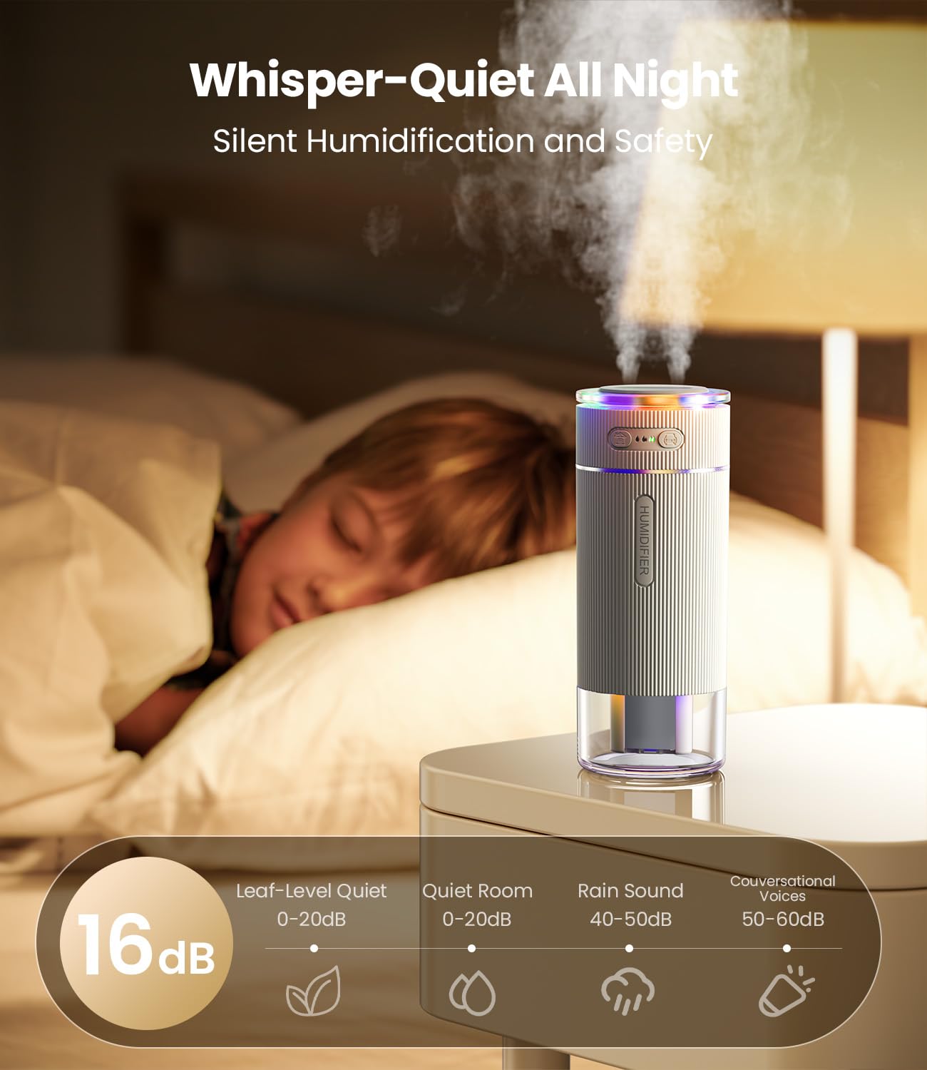 【Whisper-Quiet Humidification】This ultrasonic desk humidifiers operates at a noise level below 16 decibels—so quiet, you can barely hear it. Enjoy efficient and peaceful humidifying without interruptions during sleep or work.