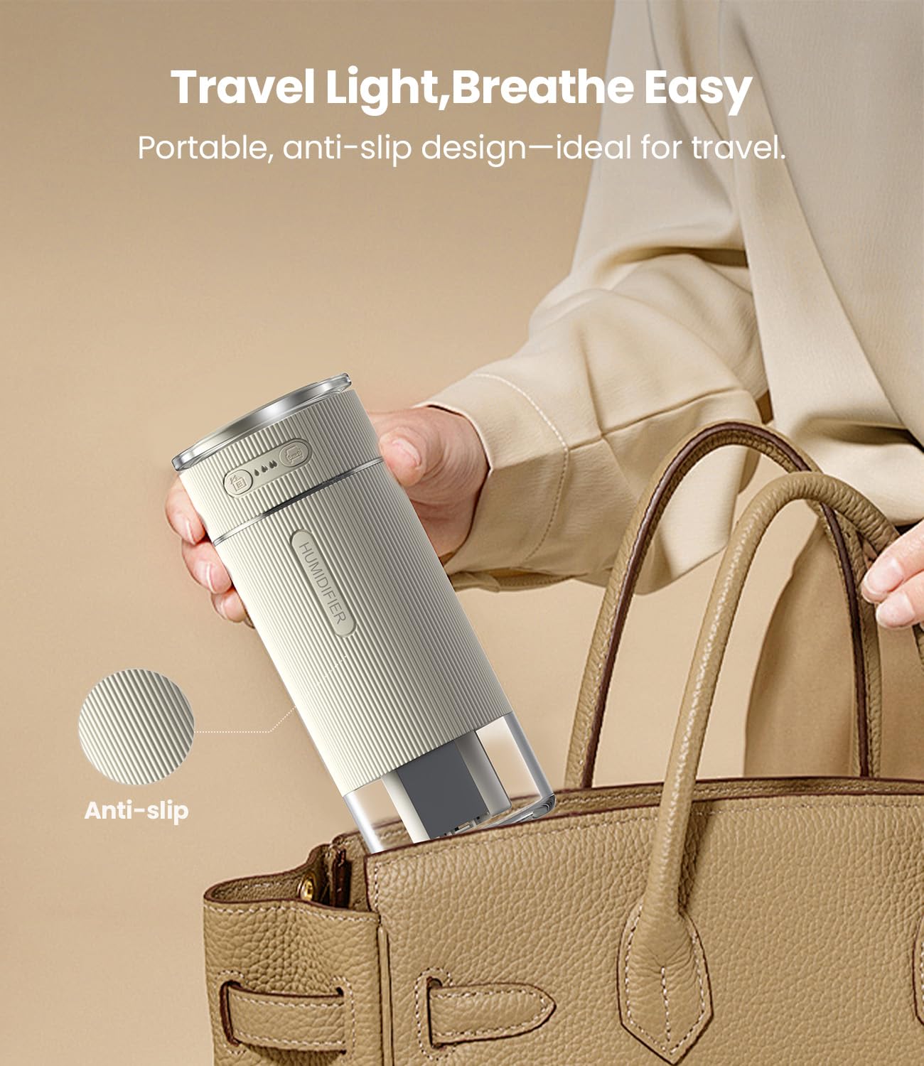 【Portable Travel Humidifier】This compact portable personal humidifiers (2.95'' x 2.95'' x 7.32'') features a handheld, anti-slip, and leak-proof design. Equipped with a 4000mAh long-lasting battery + 350ml capacity(it provides up to 6 hours of continuous mist). The perfect companion for your outdoor travel.