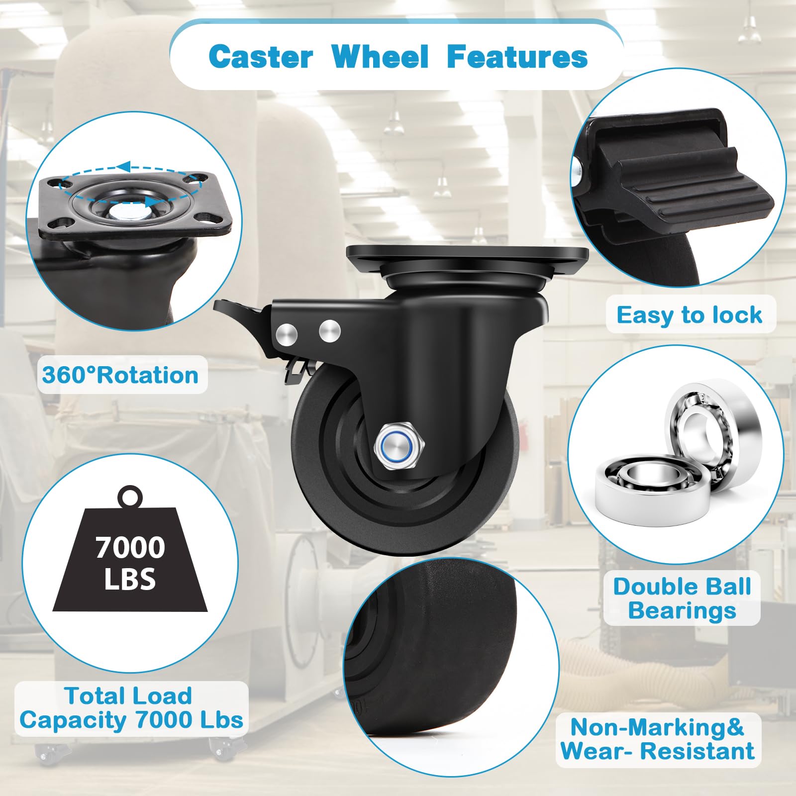 Heavy Duty Casters for Demanding Tasks:Engineered with reinforced steel frames and precision ball bearings, each 4 inch heavy duty caster effortlessly supports up to 7000 LBS. Built to stabilize heavy machinery, tool carts, warehouse racks, and more—resistant to deformation even under prolonged stress