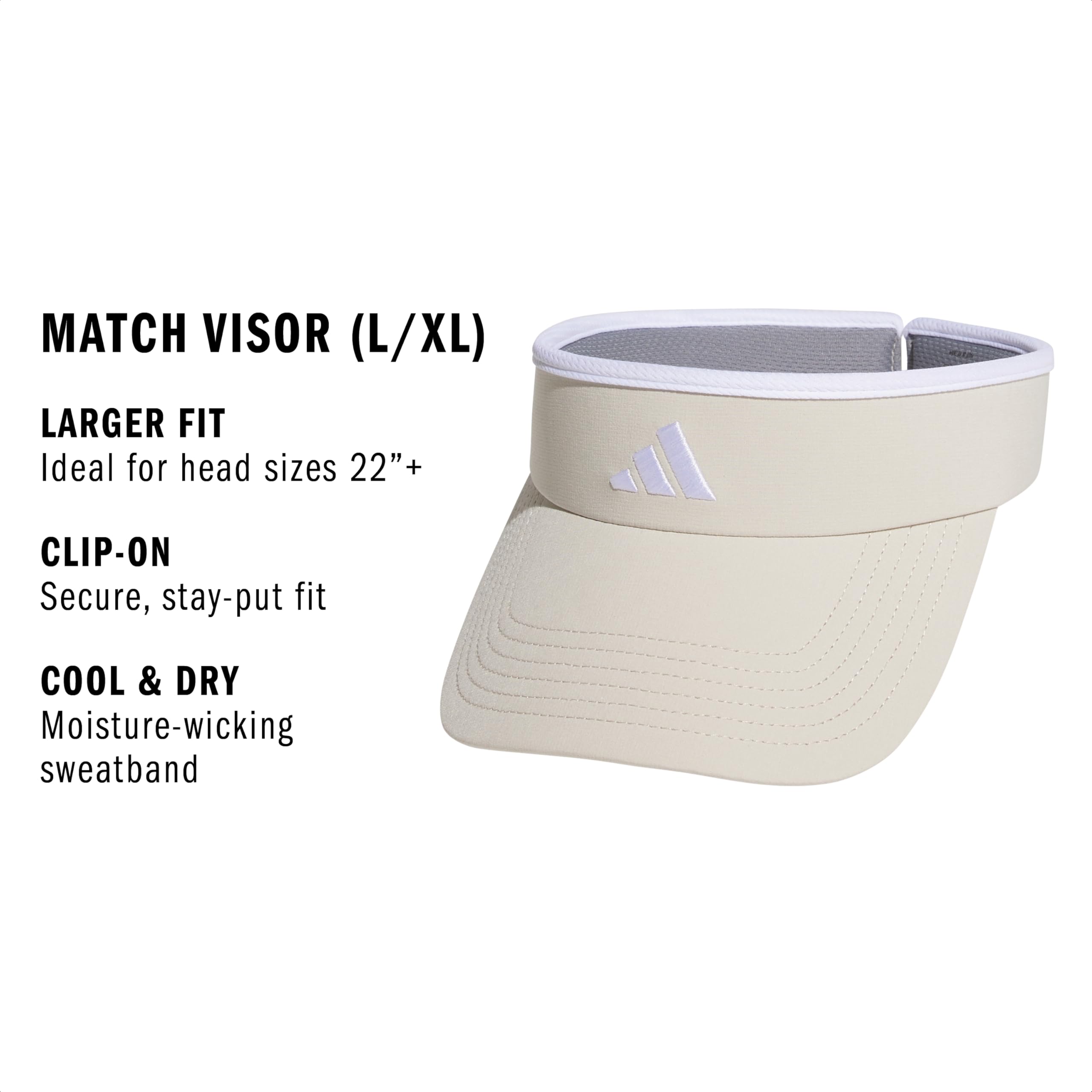 Description Keep glare and hair out of your eyes wearing this women's adidas Match 2 Visor. Its lightweight, one-size-fits-all design provides full brim coverage for the court, the beach or wherever. Sweat-wicking material keeps you dry through game, set and match.