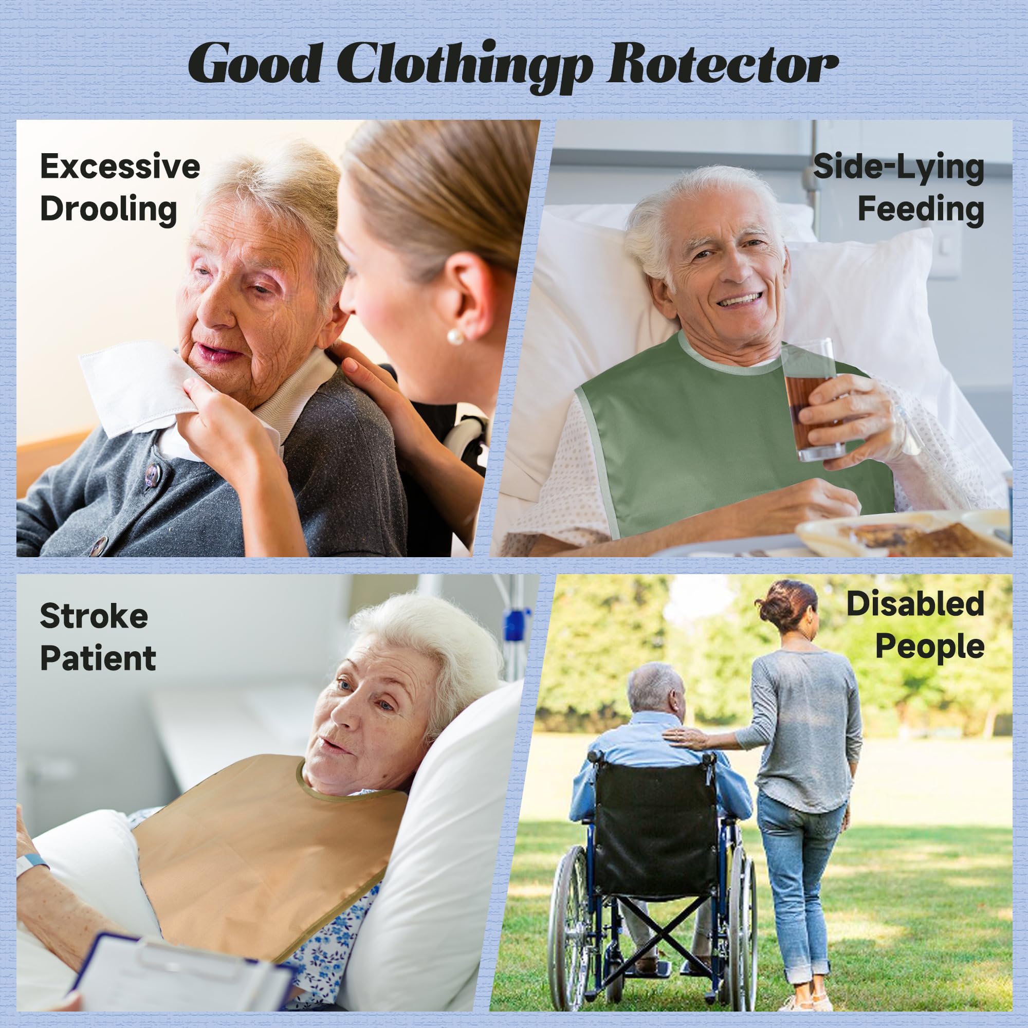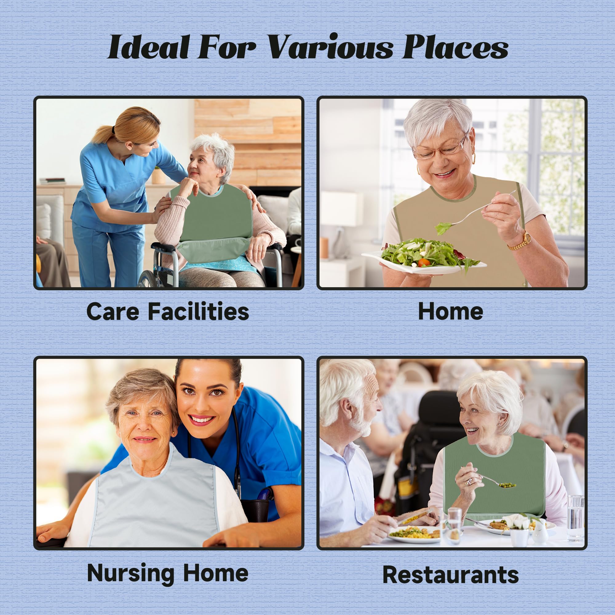 Pedobi bibs for adults for eating are adjustable, waterproof, reusable, and washable, ensuring that the elderly user keeps clothes neat and tidy during meal times or other activities