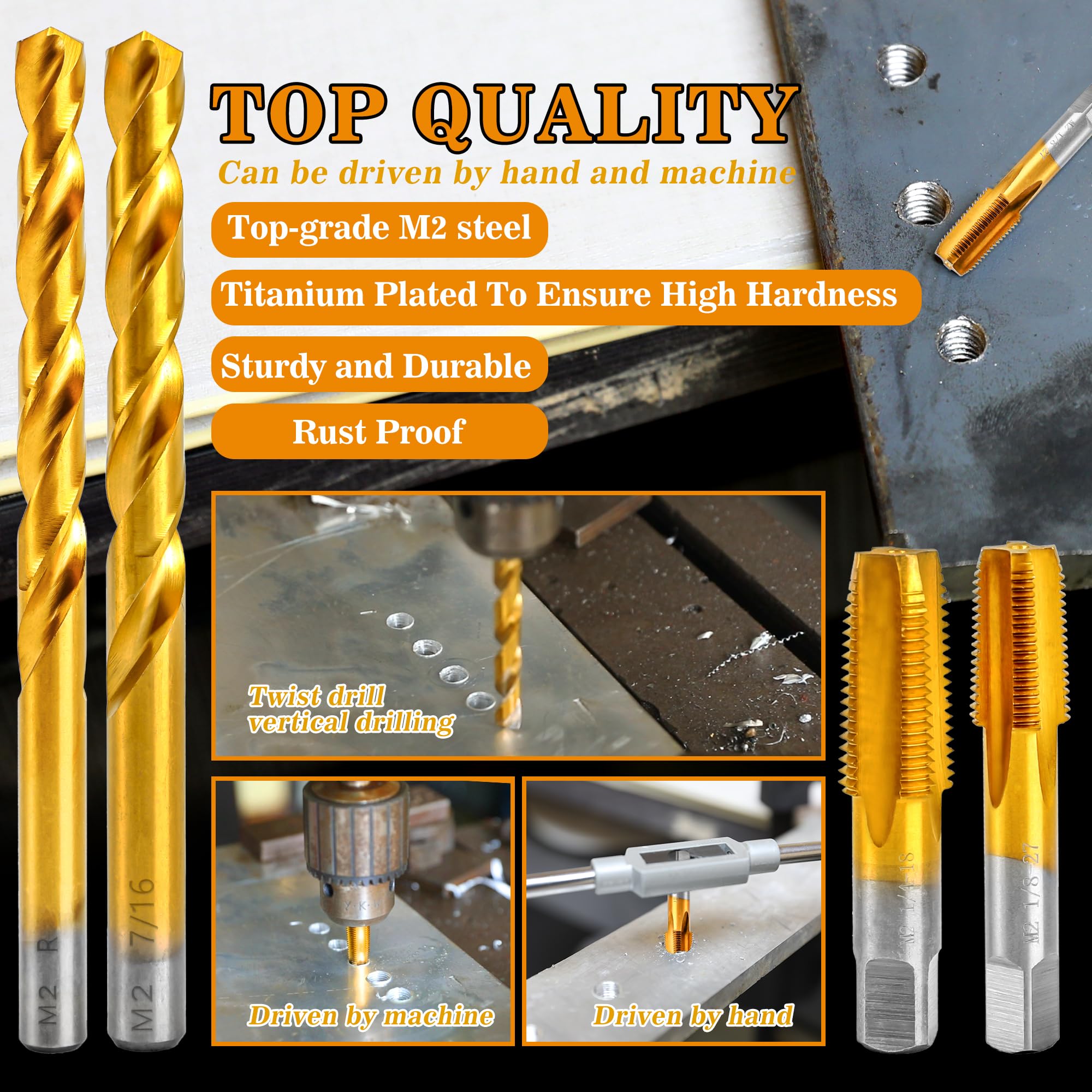 【Top Quality】All the NPT taps and drill bits are made of top-grade M2 HSS and are titanium-plated to ensure its high hardness, rust proof, sturdy and durable.