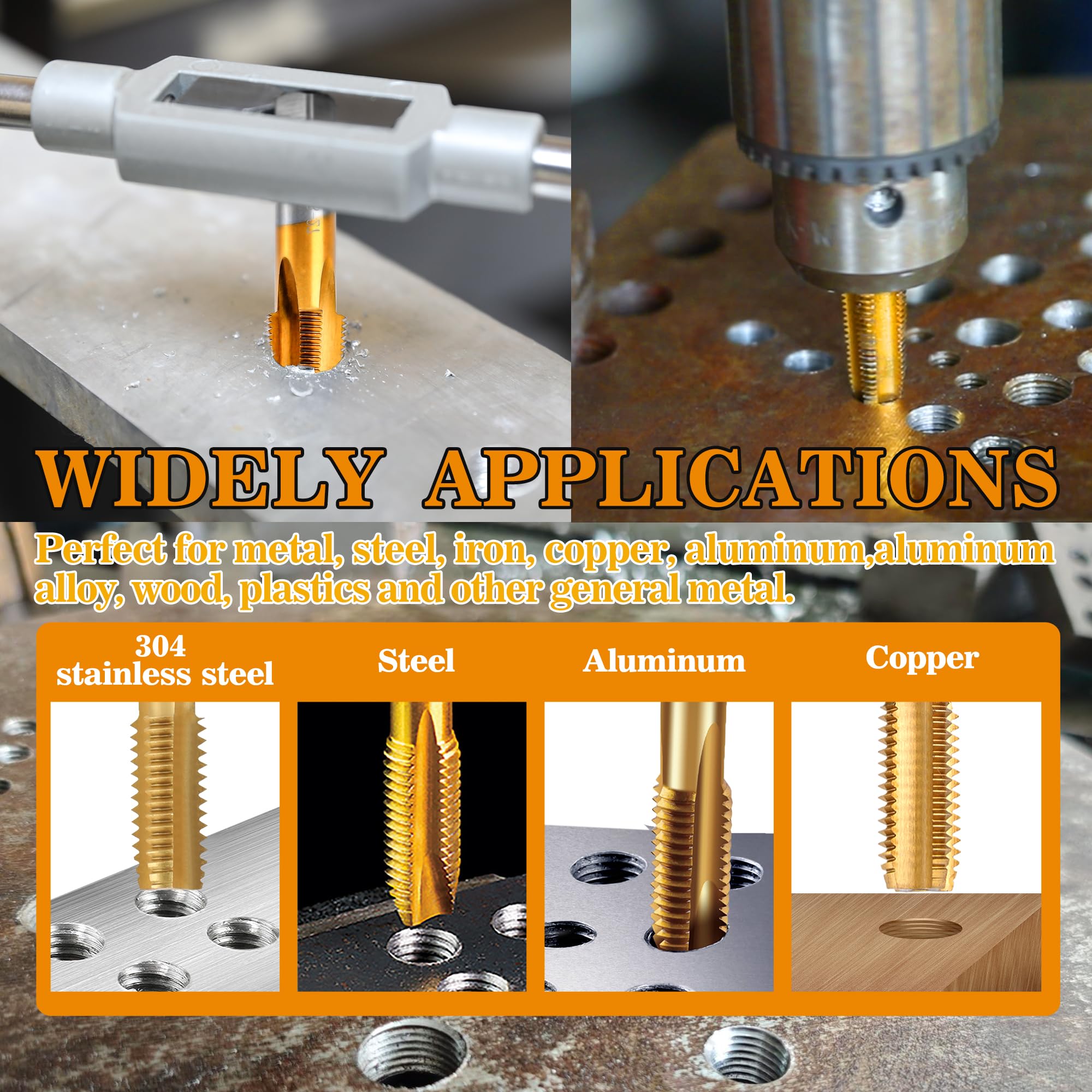 【Widely Application】The NPT thread design of this pipe thread tap drill bit set can create a secure and leak-free connection between pipes or fittings. This makes them widely used to accurately repair damaged pipe threads on metal pipes, iron pipes, aluminum pipes, copper pipes, plastic pipes, etc.