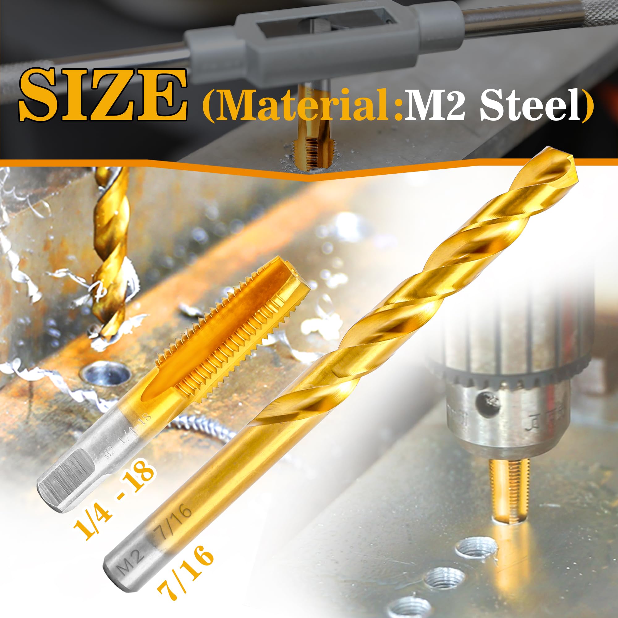 【Size】Include 1pc M2 HSS 1/4-18 NPT tap and 1pc 7/16" M2 HSS drill bit,all stored in a storage box for easy carrying.