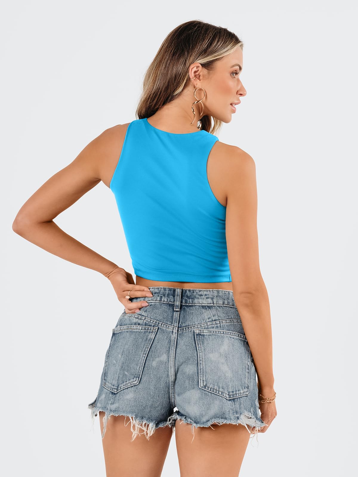 Fashion Design: Double layer of this crop top can wear without bra,and the material also good for work out sports,high neck design and crop top style,basic,fitted,casual style,crew neck ,sleeveless, slim fit