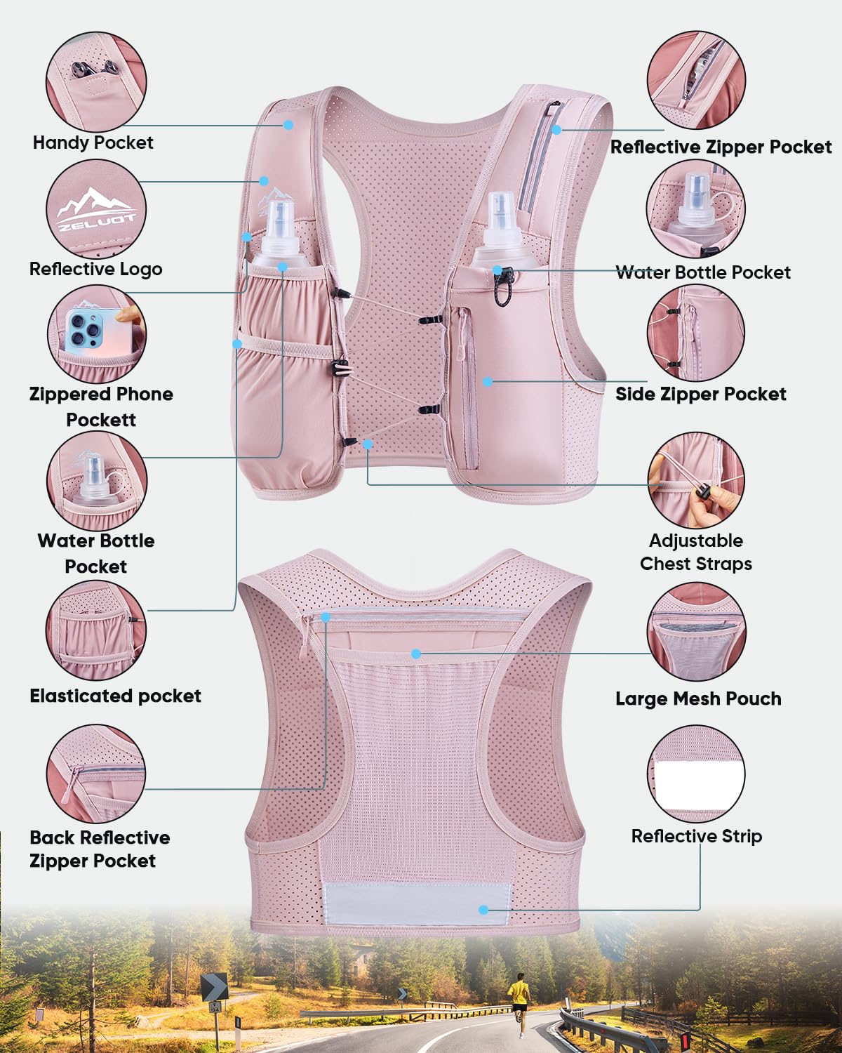 Breathable and Featherlight - Zelvot hydration vest is made from breathable, lightweight neoprene with triple-sized ventilation holes for accelerated air circulation and moisture-wicking. It barely tips the scales at 7.5 ounces, ensuring it won't slow you down. Reflective logo and strip on the front and back increase safety in low-visibility scenarios. This reflective running vest makes every run farther, safer, and more comfortable.