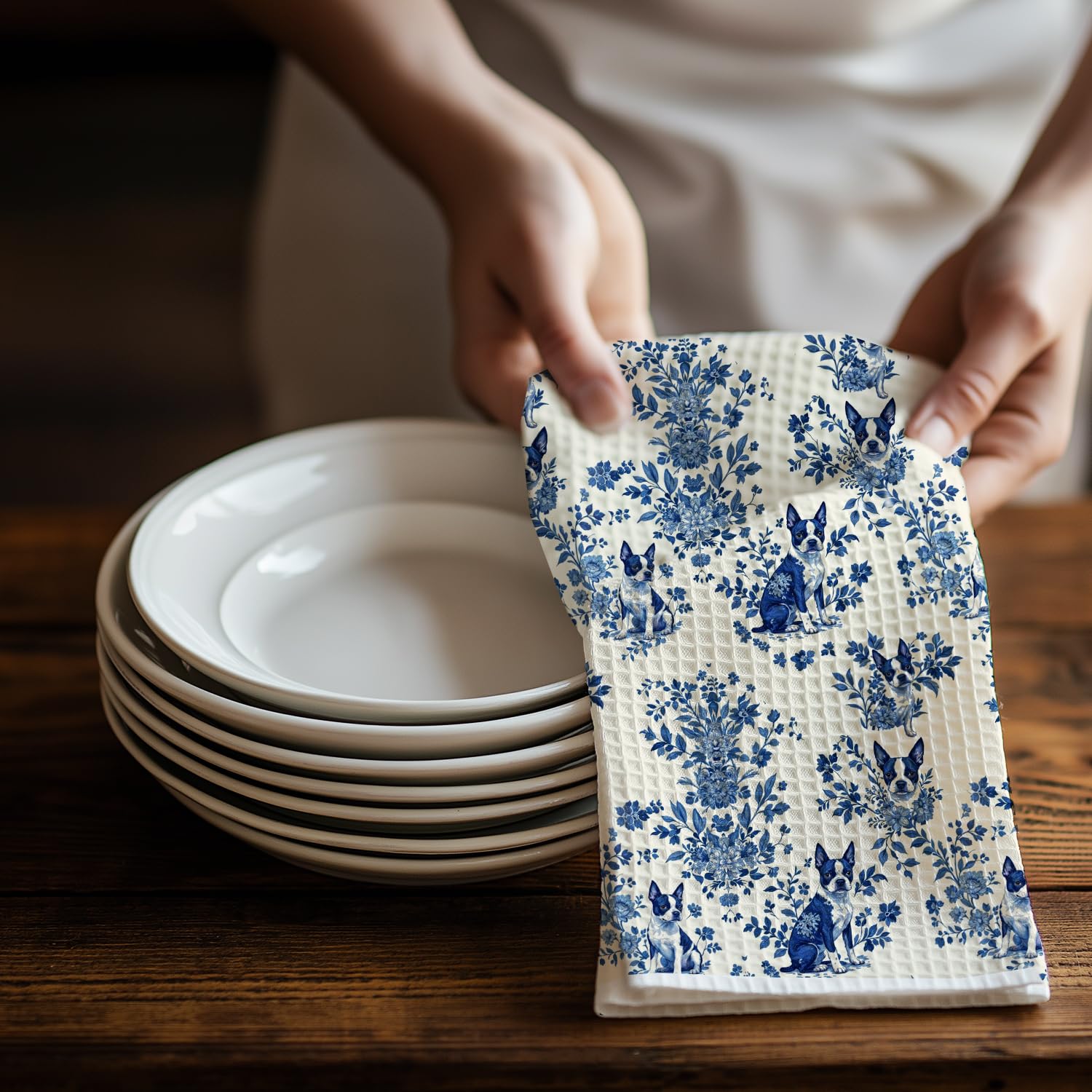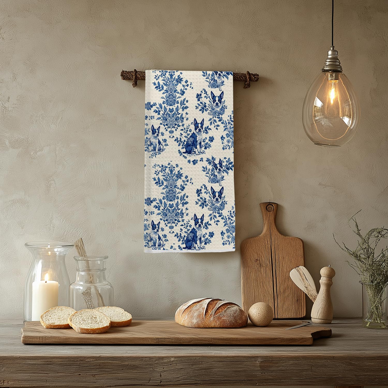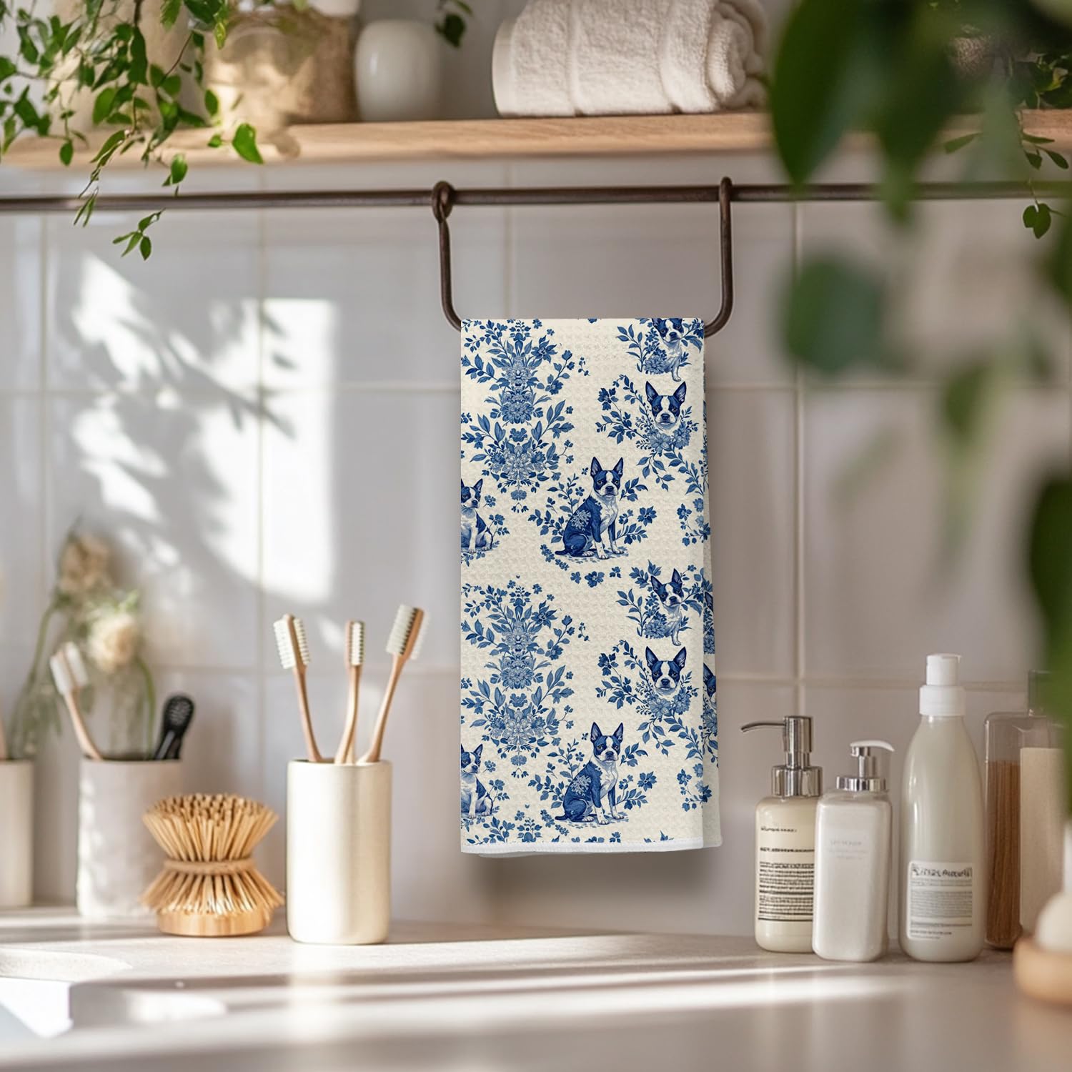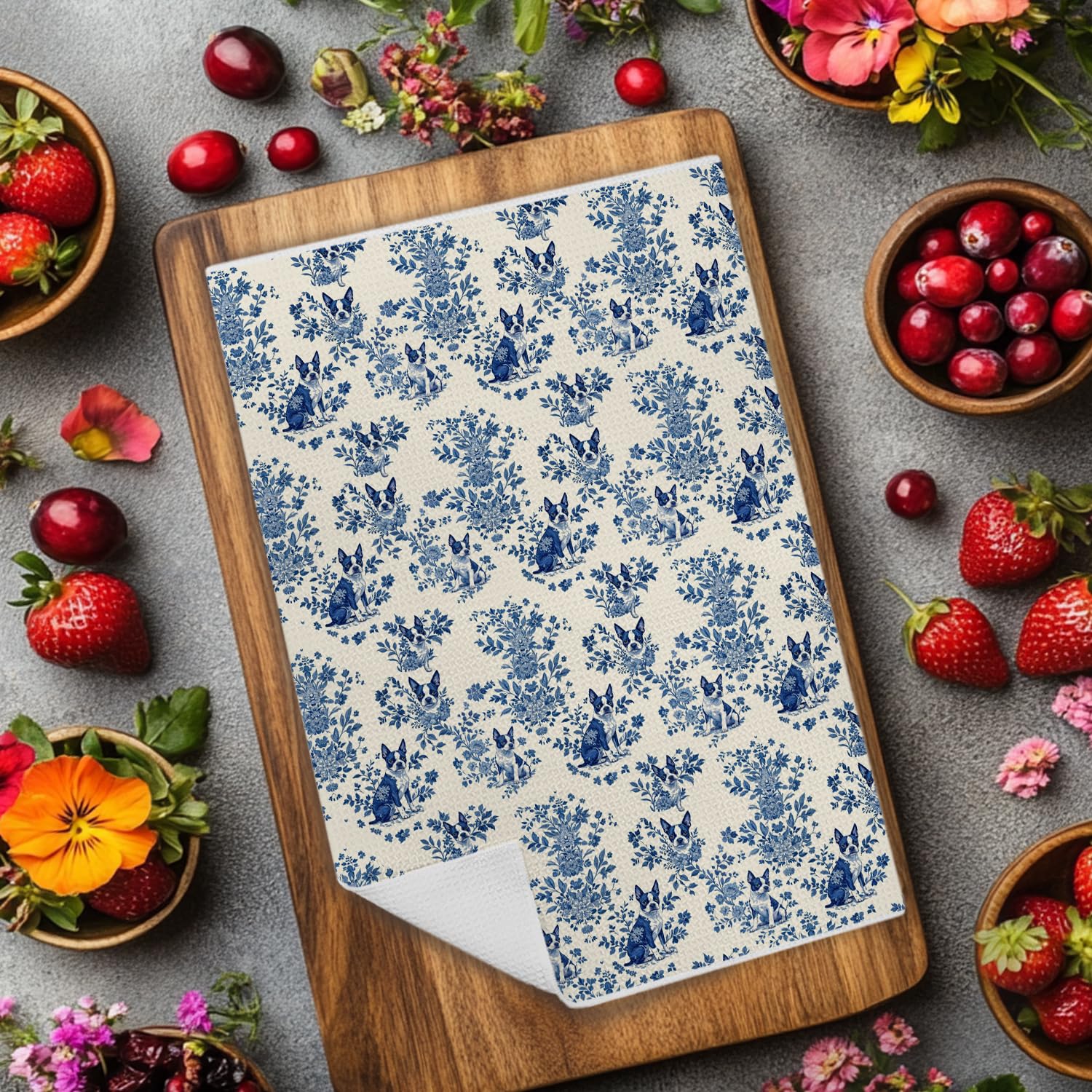 Add playful elegance to your kitchen or bathroom with the EKGJW Boston Terrier Toile Towel Set. Designed with a nod to French country aesthetics, these towels feature blue floral arrangements and Boston Terriers in a repeating toile pattern that’s equal parts charming and chic. Made from durable waffle weave microfiber, each 16x24 inch towel offers excellent absorbency and dries quickly. Whether used for drying dishes or simply as a stylish accent piece, they bring warmth, personality, and utility to any space. Whether you're curating a cottagecore kitchen or gifting a dog mom who loves vintage prints, this 2-pack towel set is sure to make tails wag.