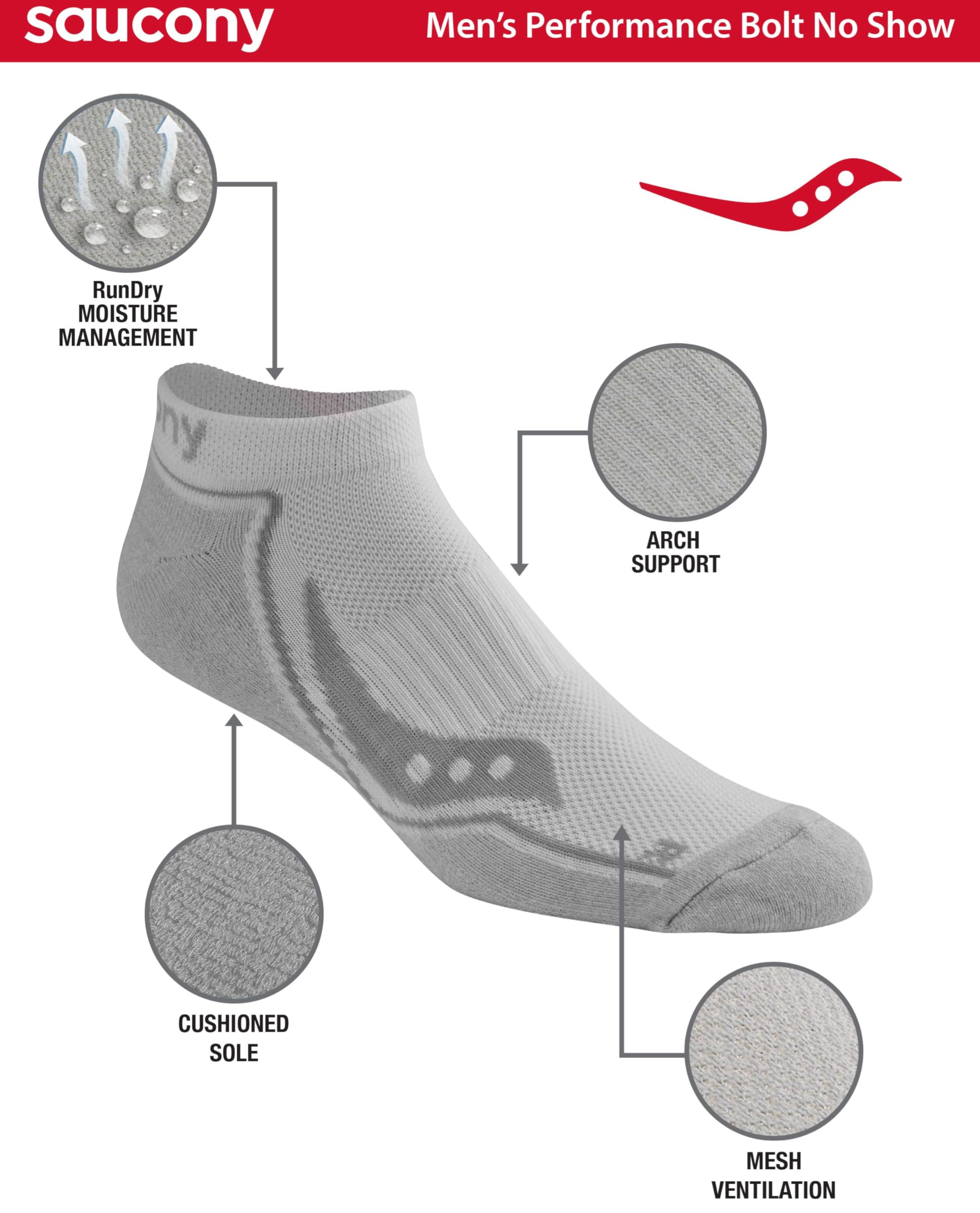 Description Saucony men's performance no show socks is a perfect combination of comfort and support. Great for the toughest training sessions. Its arch support, air mesh venting, and moisture management features will ensure lasting comfort. Run for Good - Saucony was founded way back in 1898. Ever since, we have been loyal to the sport, building goodness into every product and inviting millions around the world to run with us. At Saucony, we exist for runners, Runners inspire us, bringing us new idea, force us to be better, they drive our design and engineering. They keep us competitive. They keep us hungry. They keep us honest. This focus and passion fuels us as we strive to create the best running shoes and apparel on the planet. We leave work each day knowing we’ve done everything to make runners live just a little better.