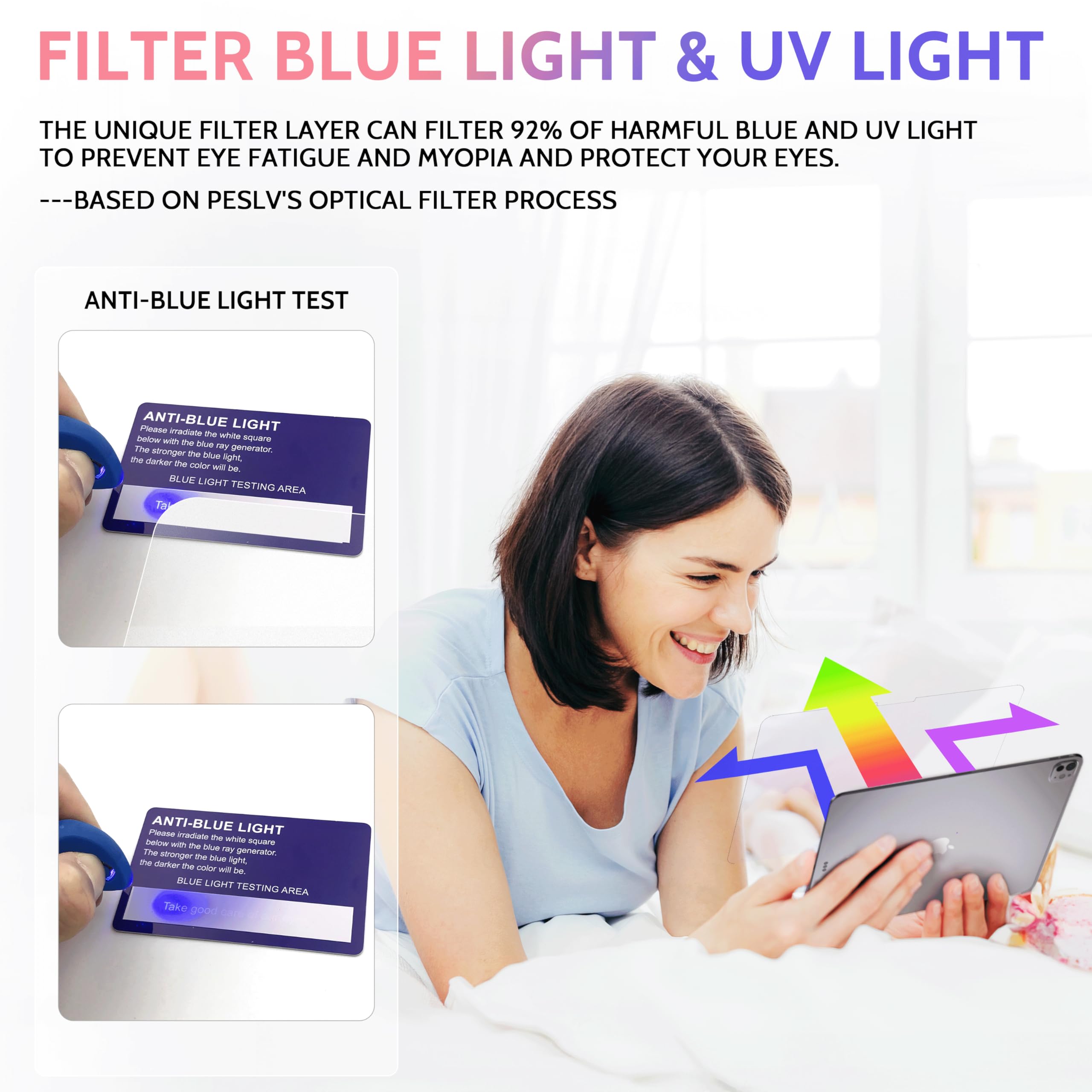 【Protect Eyes】Peslv is committed to solving the light pollution created by the screen during the use of iPad, such as dazzling glare, and blue light that causes vision loss and dull skin. Peslv paper ipad air m2 screen protector uses the most advanced nano-dot technology and self-developed filtration technology, with a glare suppression rate of up to 95% and a blue light blocking rate of 92%, protecting our eyes and skin.