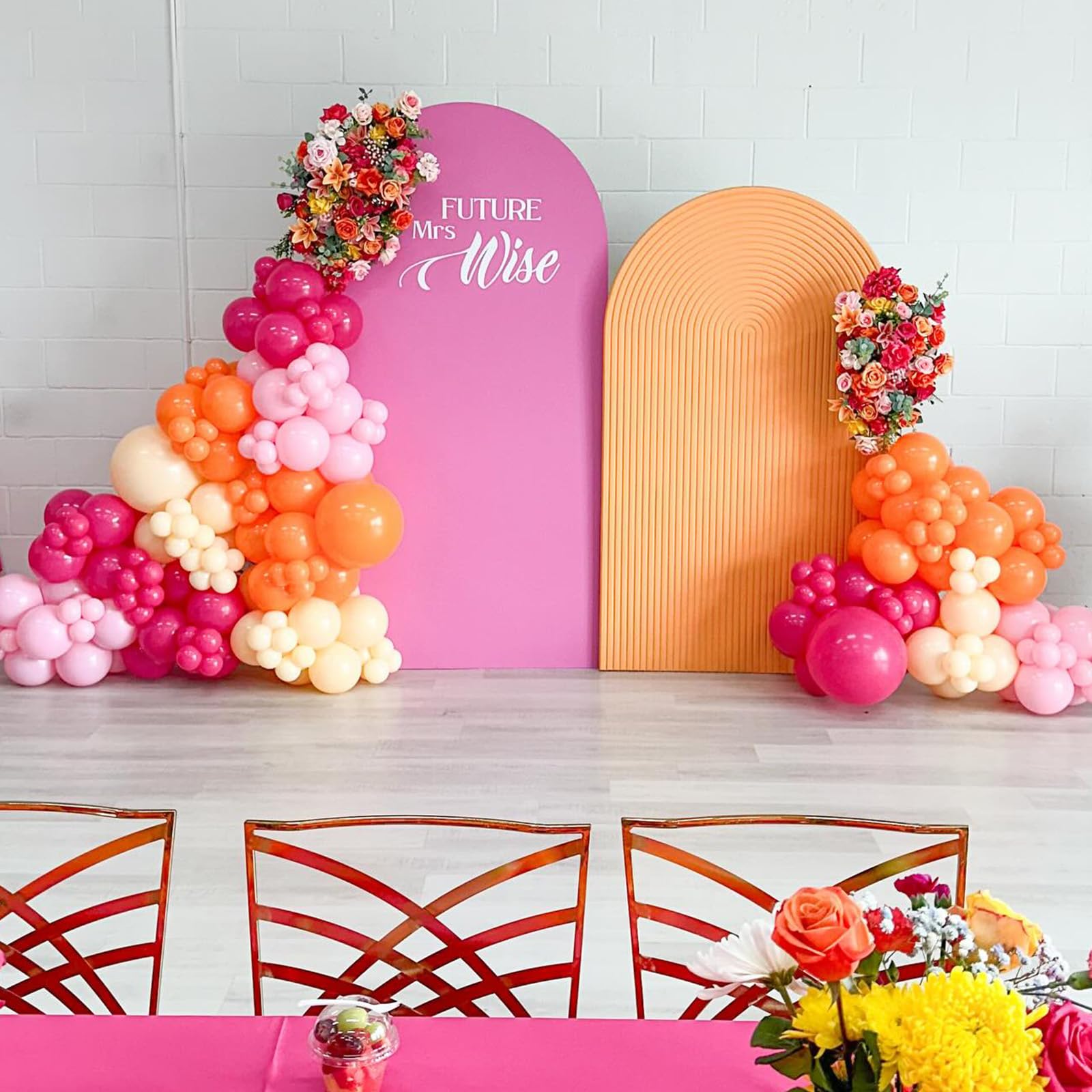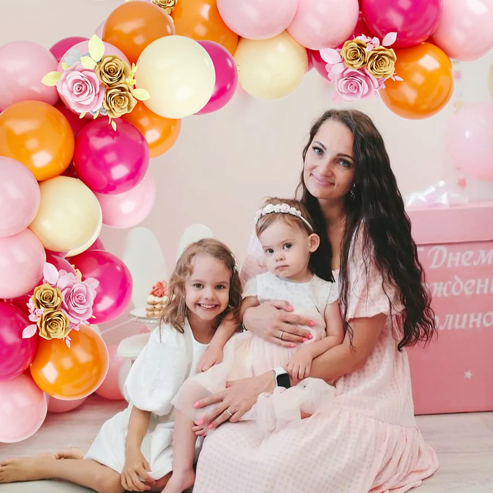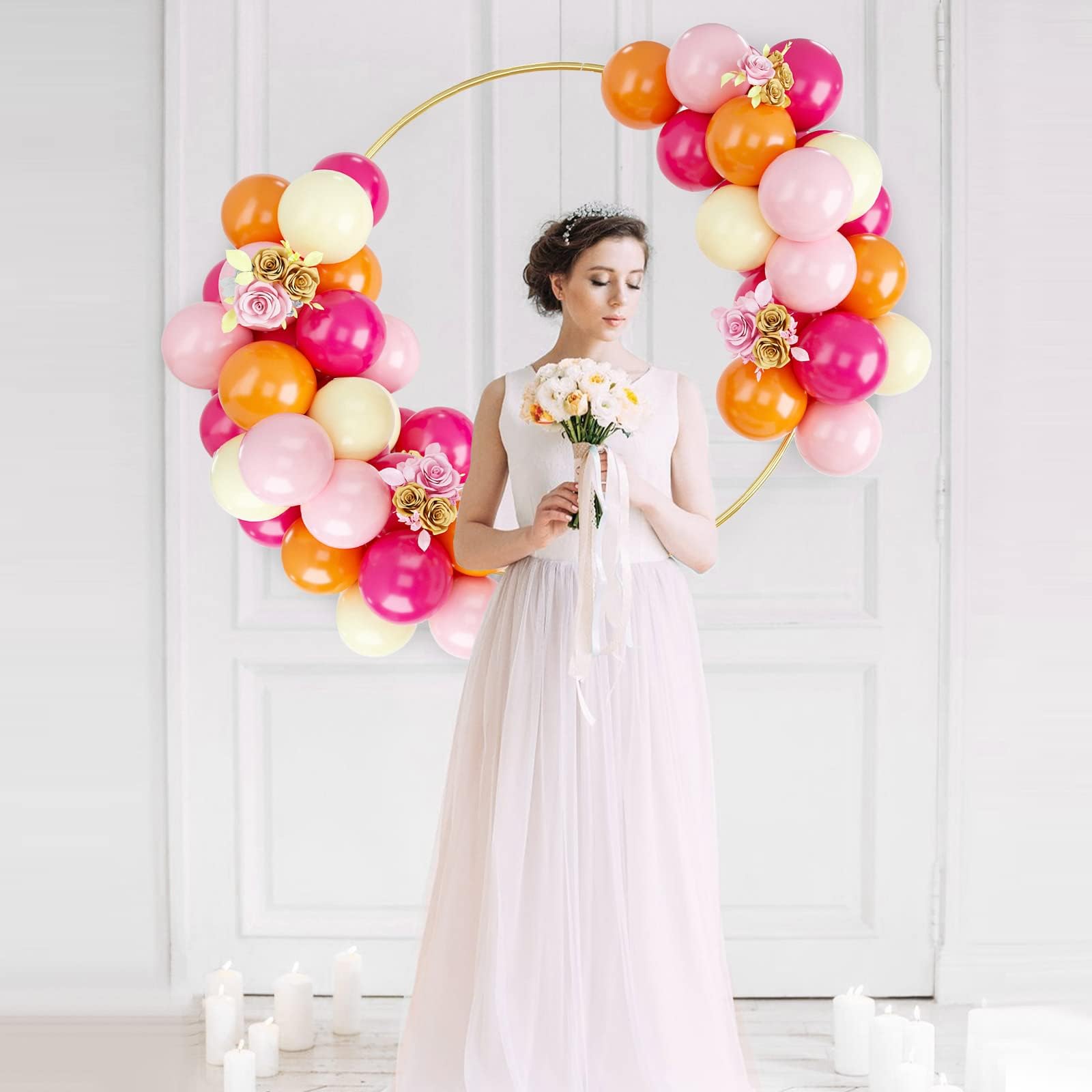 50PCS Pink Yellow Orange Balloon Arch:include 10*10 inch hot pink, 15*10 inch light pink, 10*10 inch orange, 15*10 inch pastel yellow, 1 * balloon chain, 1 * ribbon. Our party balloons can be used to DIY balloon garlands and then used to decorate dessert tables, or can be hung on the wall for decoration, or used as photo props