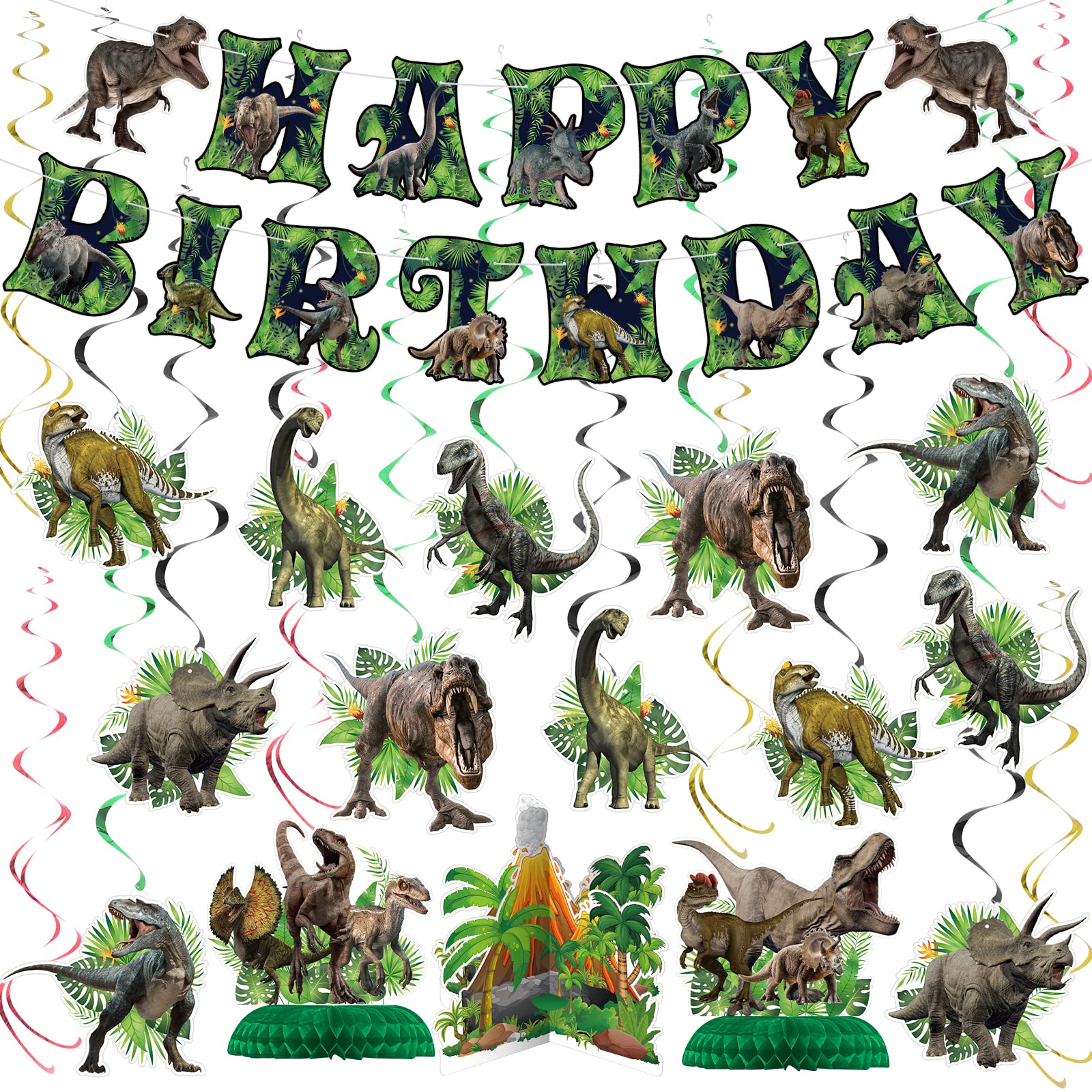 Dinosaur Design: Our dinosaur plates and napkins features jungle dinosaur themed design, dinosaur world design with different dinosaurs and tropical jungle elements, printed with roaring dinosaurs, mountains, tropical palm leaves and the word of "Happy Birthday", easily decorate your dinosaur theme birthday party