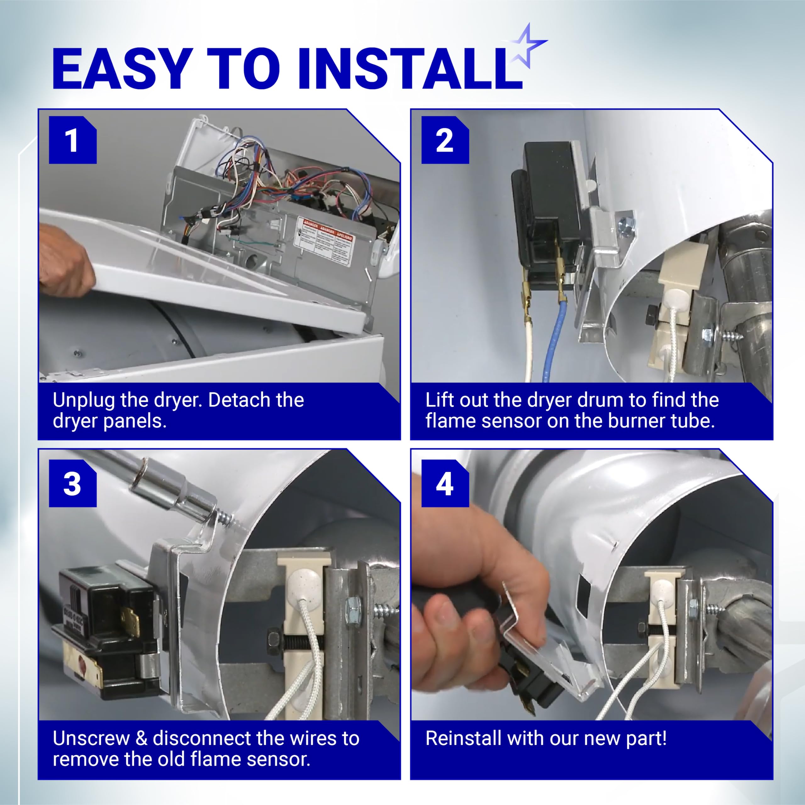 PREMIUM QUALITY: The replacement part is made from durable high-quality material and well-tested by the manufacturer - Meet OEM standards - Ensure long lasting and effective operation. This part fixes the following symptoms: No heat or not enough heat | Takes too long to dry | Shuts off too soon | Will not start. To repair, the main top of the dryer should be lifted, as well as the front panel to access the component.