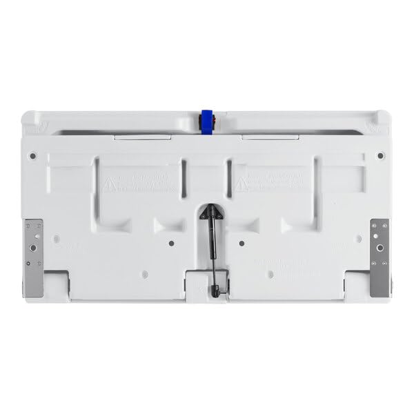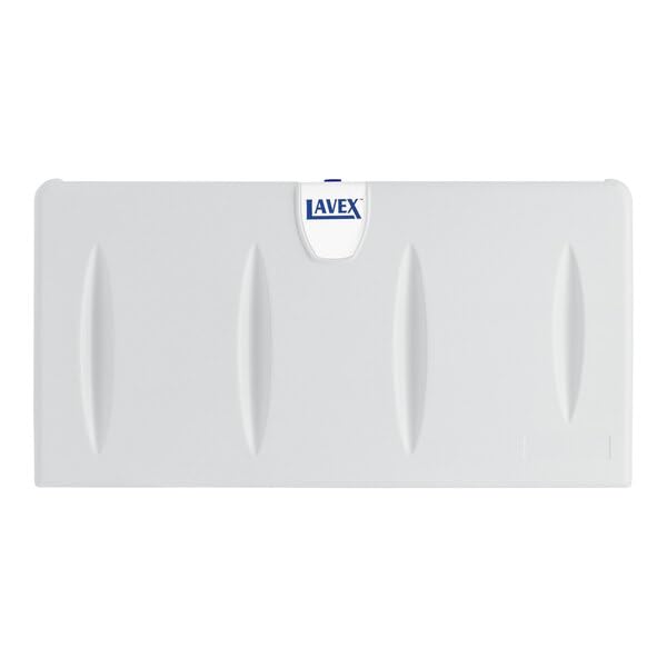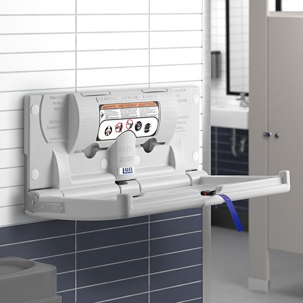 Transform your facility's restroom with this Lavex wall-mounted baby changing station. Crafted from durable polyethylene with a sleek gray finish, this horizontal changing table offers a generous 50 lb. capacity supported by robust steel-on-steel hinges. The thoughtfully designed station includes convenient features like a built-in liner dispenser, bag hook, and an easily adjustable safety strap that can be operated with one hand. Measuring 34 1/4 inches wide and 15 3/8 inches high, it folds to just 4 inches deep when not in use, making it ideal for space-conscious establishments. When open, the station extends to 17 3/8 inches deep, providing ample space for diaper changes. Perfect for restaurants, hotels, and other commercial spaces, this ADA-compliant unit comes with mounting hardware and clear instructions in multiple languages. The polyethylene construction ensures easy cleaning and maintenance, while the built-in features help create a hassle-free experience for parents and caregivers.