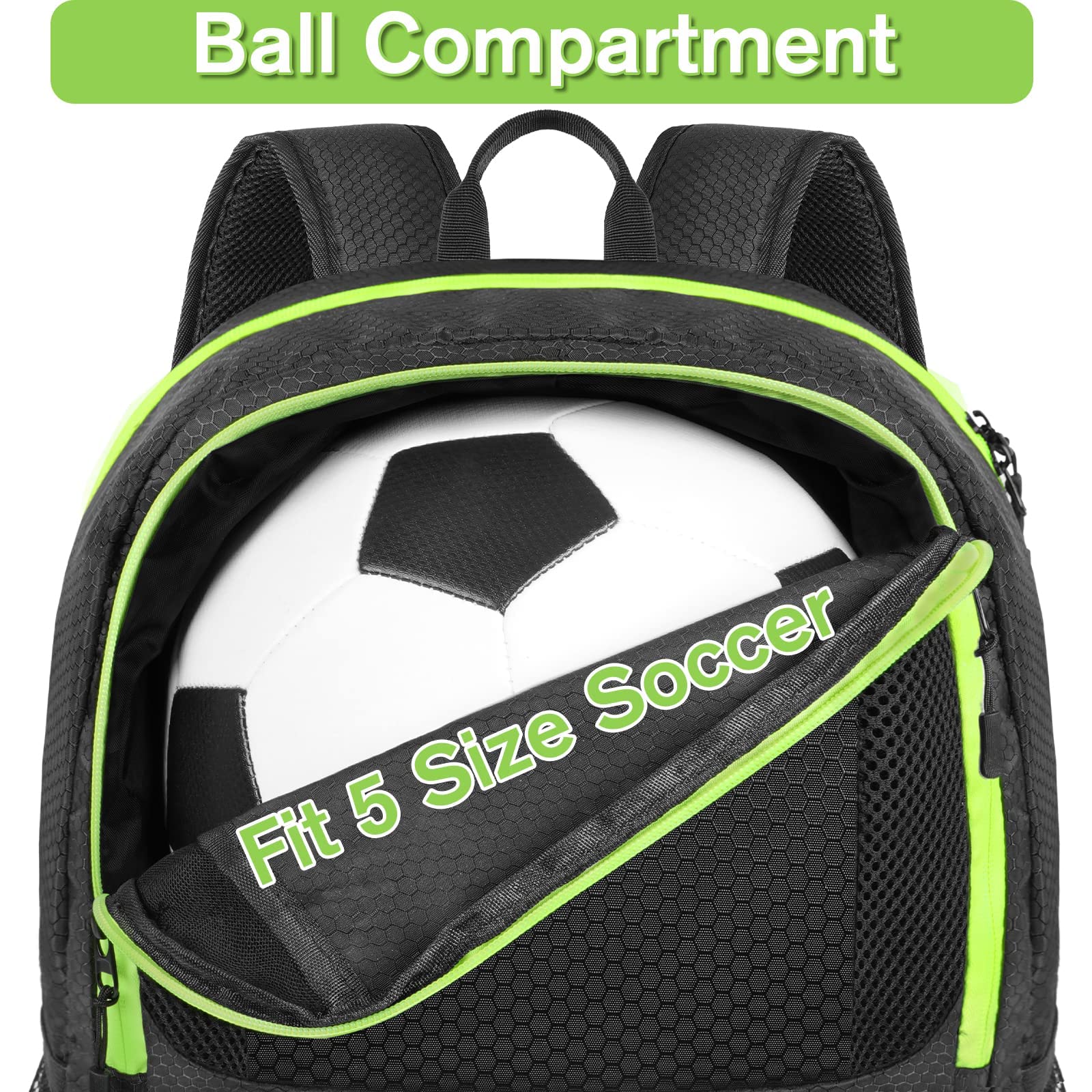 SEPARATE COMPARTMENT: The ball compartment at the top of the soccer bag can hold soccer balls, basketball, volleyball and football, up to size 7. If you are interested in multiple sports, this sports bag can definitely meet your needs in various scenarios. And another separate pocket at the bottom can carry size 10 shoes. 2 metal breathable holes in the compartment keep your soccer cleat dry at all times