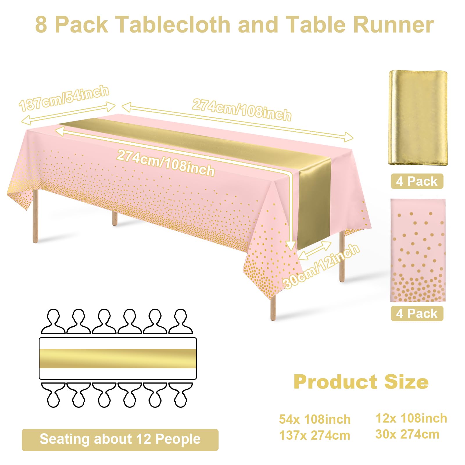 Suitable size:the plastic party tablecloth measures 54 x 108 inch / 137x274cm , the satin table runners measures 12 X 108 Inch / 30x274cm, appropriate for seat 8-10 people.large enough for you to decorate your table, moreover, suitable for most styles of tables
