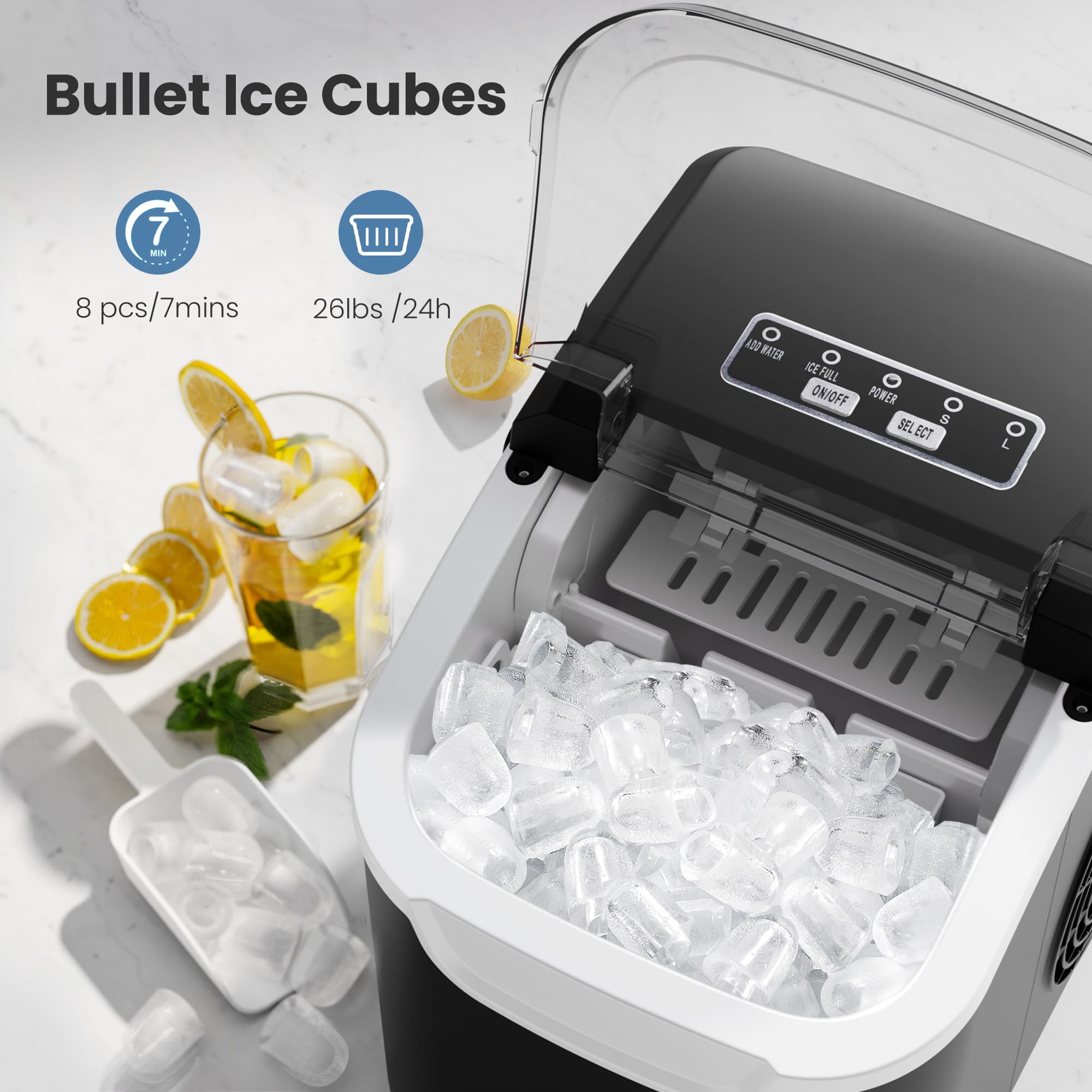 【2 Ice Cube Sizes】The ice maker machine offers two ice cube sizes including small and large. Large cubes can be used for whiskey and food preservation, while small cubes are ideal for juice, coffee, and tea. Customize ice cube size to match any drink or chilling application