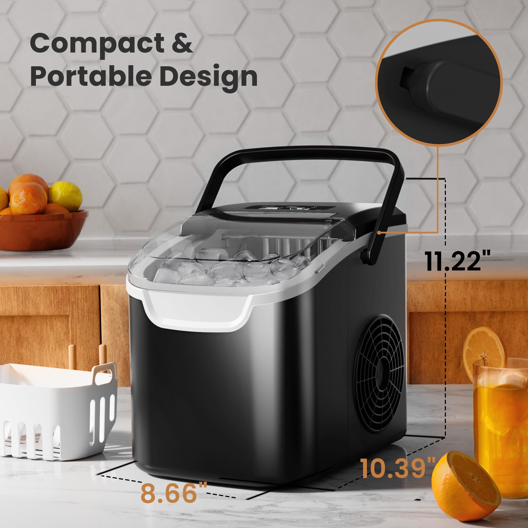 【Portable Design】Our portable ice maker countertop measures just 8.66 x 10.39 x 11.22 inches, weighs 11.77 pounds and comes with a handle. Meanwhile, it has an ice scoop holder, you can attach the ice scoop to the basket, convenient storage, not easy to lose.Suitable for any place you want and meet all your needs