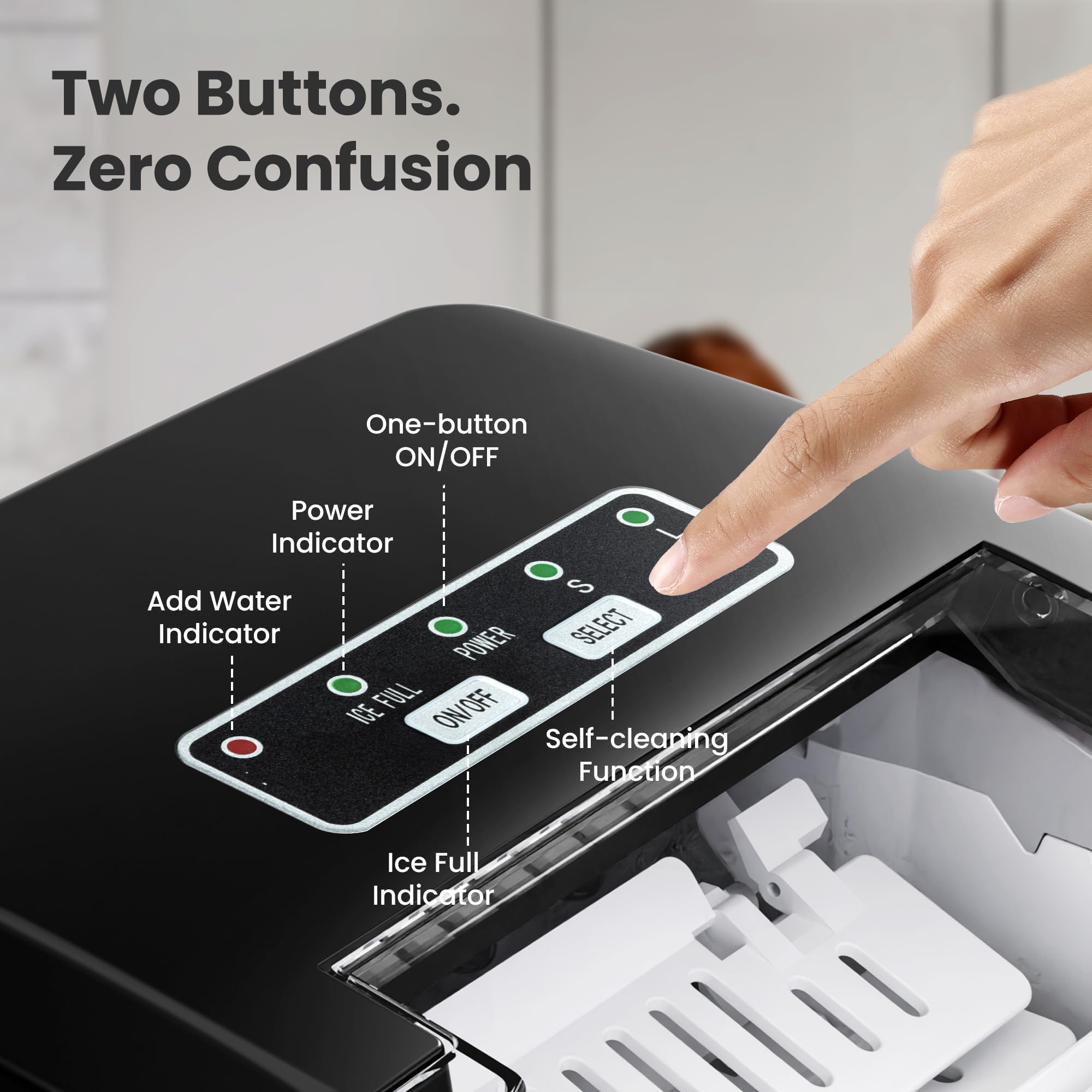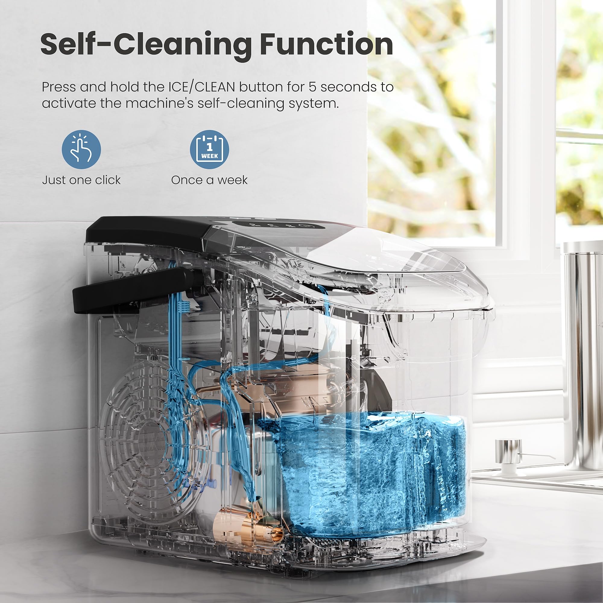 【Simple Self-Cleaning Function】The self-cleaning function of this portable ice maker thoroughly cleans every corner of the ice maker, and simply holds down the "on/off" key for more than 5 seconds to activate the automatic cleaning mode. Not only does it save you time and effort cleaning, it also ensures that you enjoy clean and healthy ice