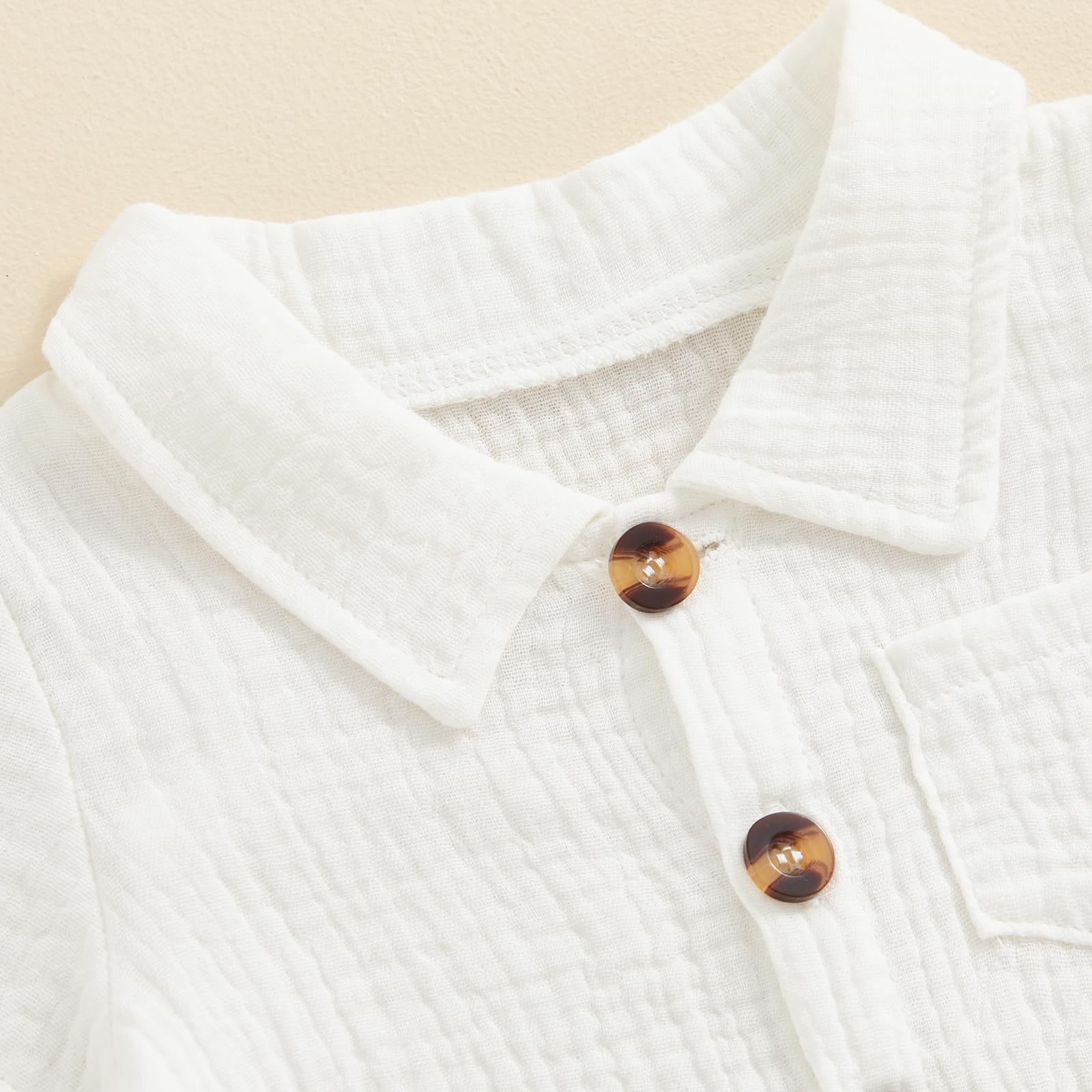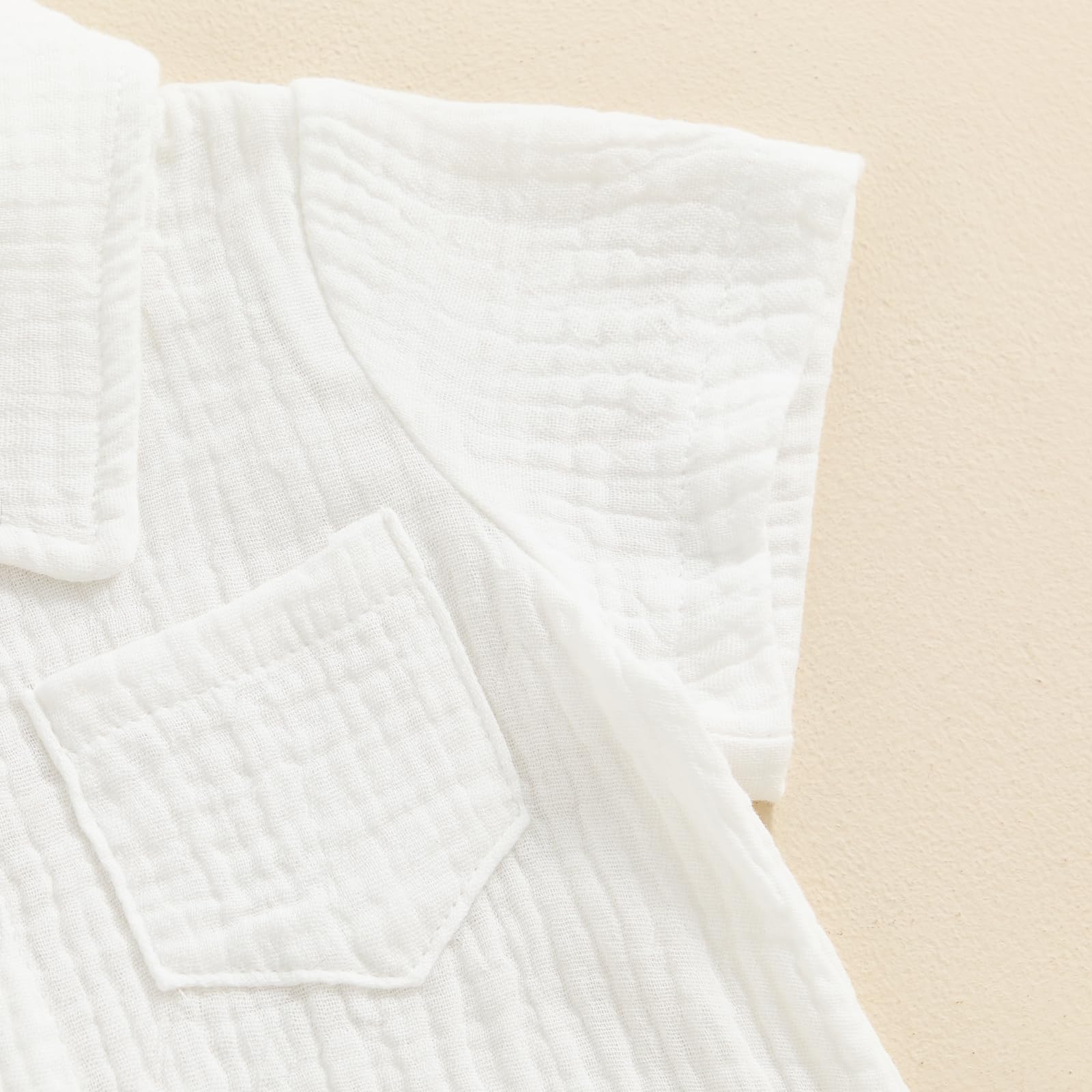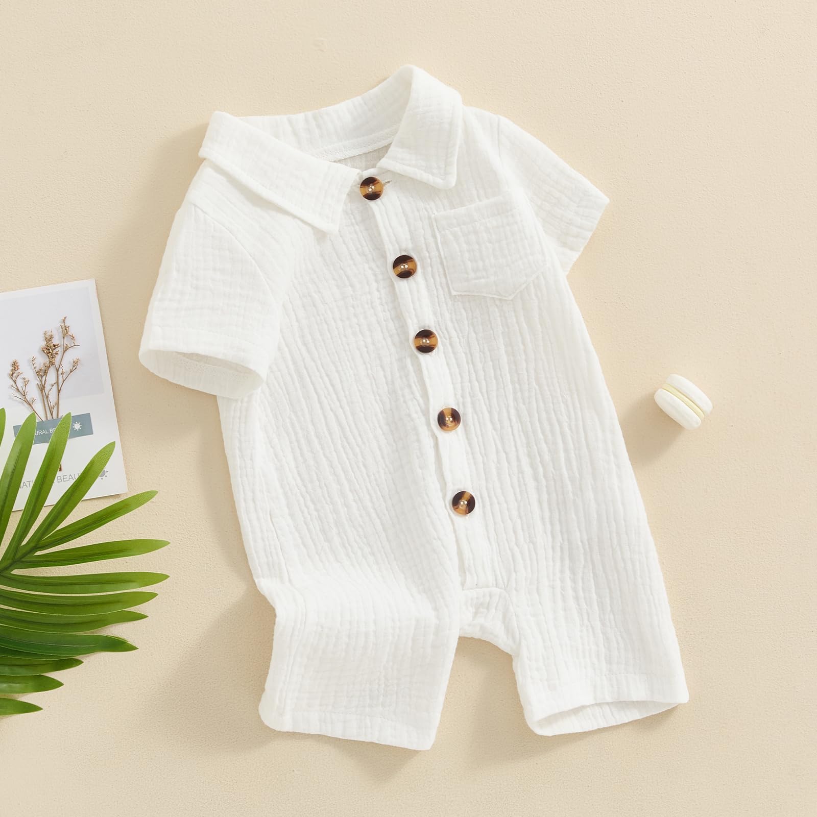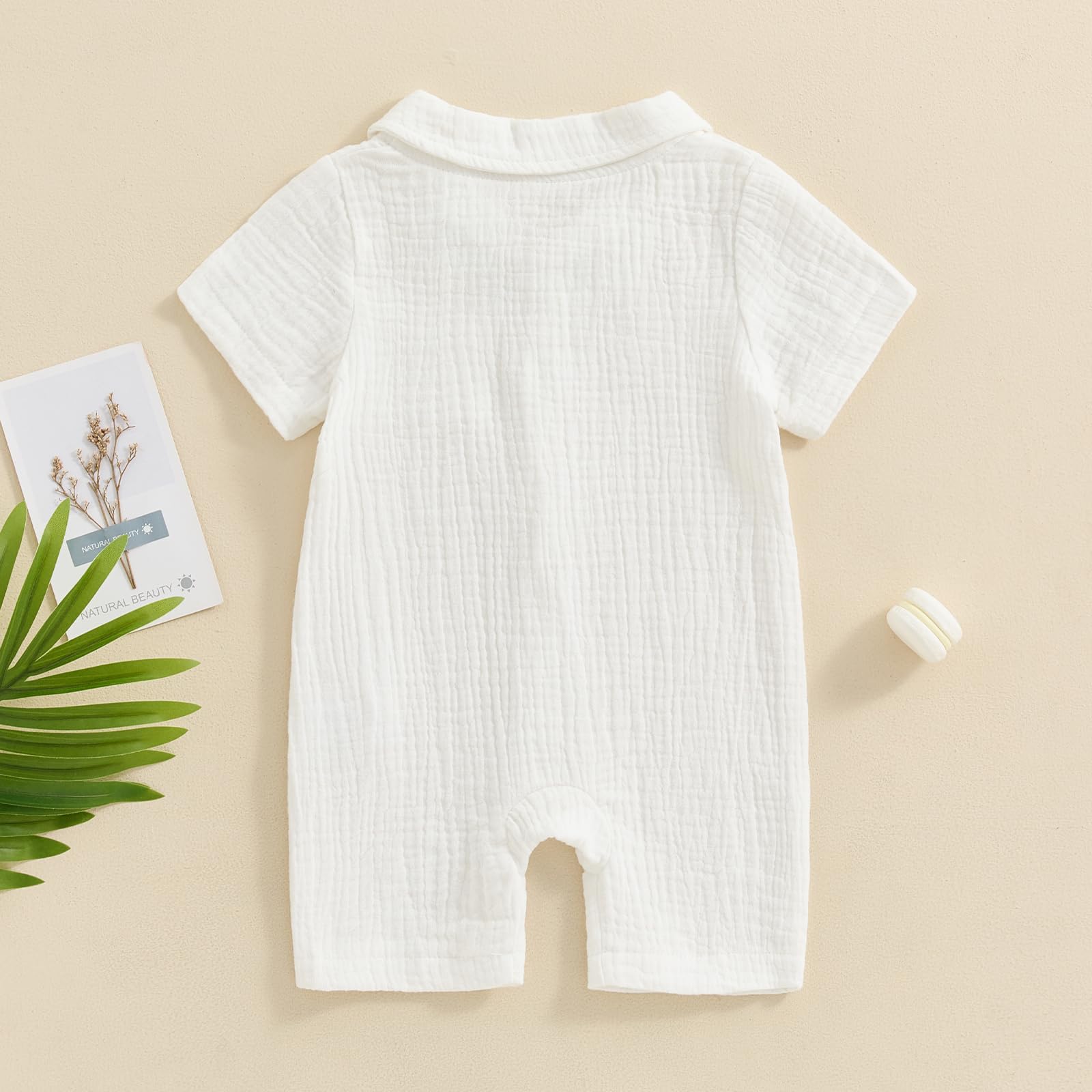 Features - Summer baby boy romper jumpsuit, short sleeve, lapel collar, button down, solid color, one chest pockets design, casual cotton linen jumpsuit playsuit for infant boys.