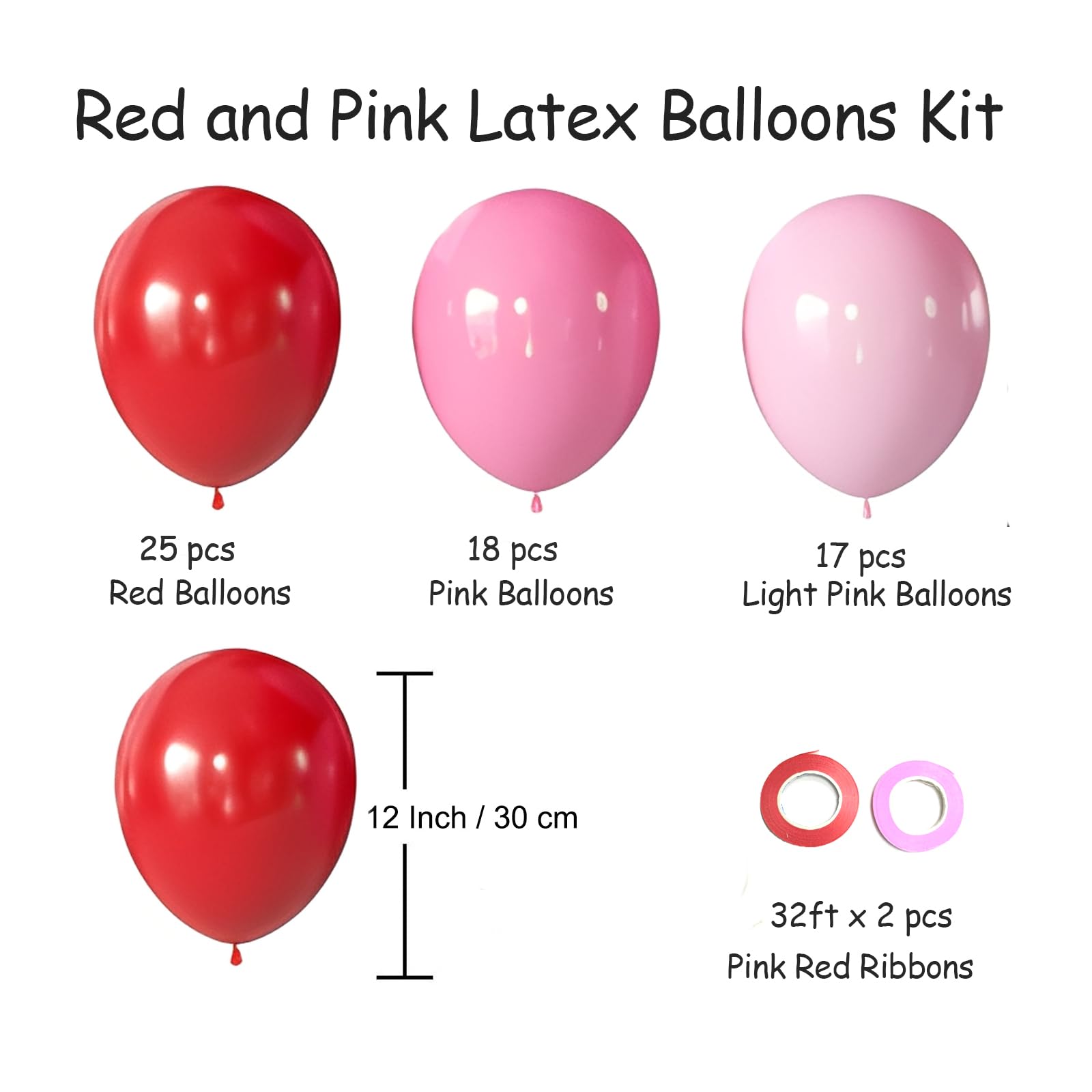 【All-in-One Kit】: This pink and red balloons kit includes everything you need to create a stunning decoration, red balloons 25pcs, light pink balloons 17pcs, pink balloons 18pcs, pink red ribbons 2pcs. The size of the balloon is about 12 inches after inflation. these pink and red latex balloons are durable and long-lasting. They are resistant to popping and stay inflated for hours, making them a reliable choice for your party decorations.