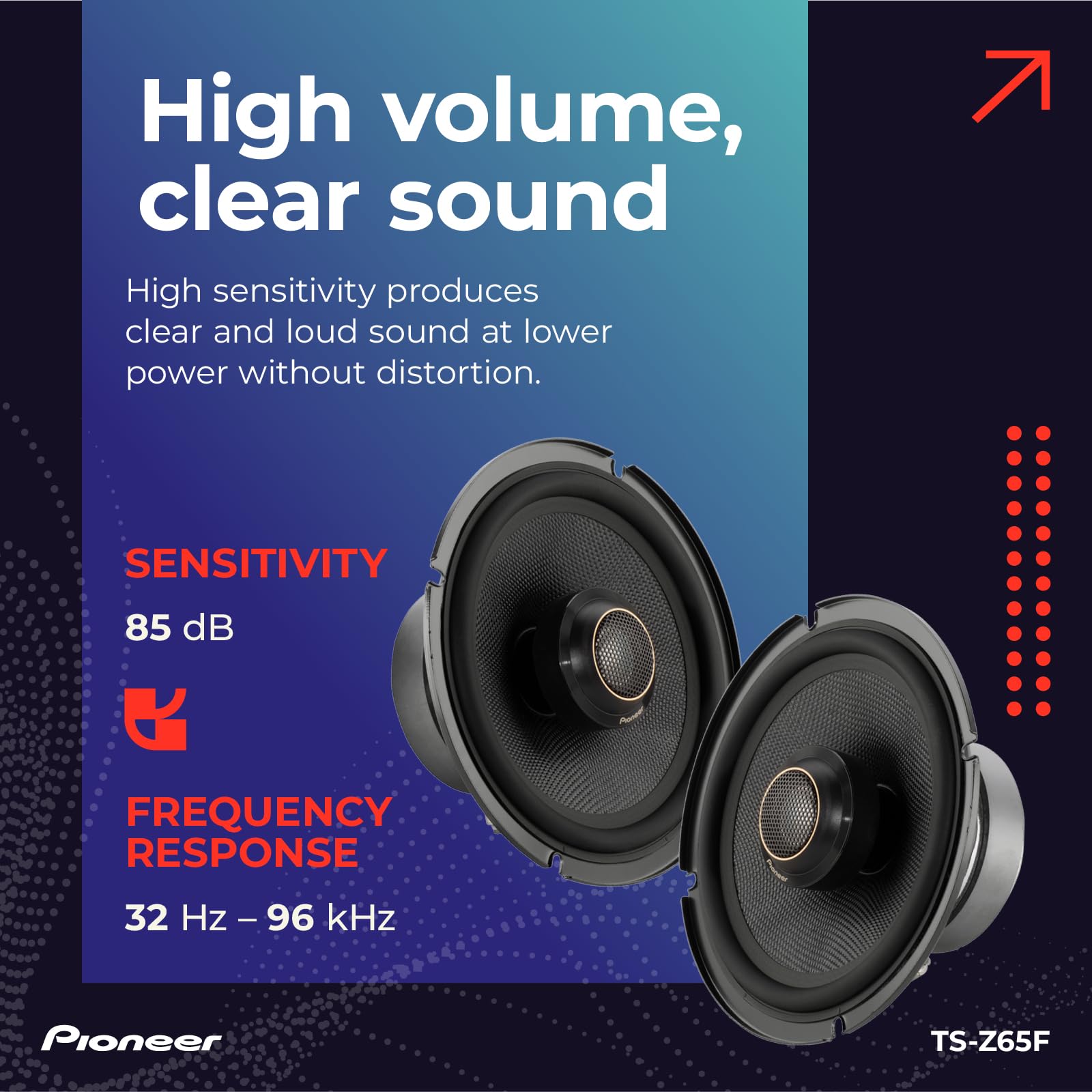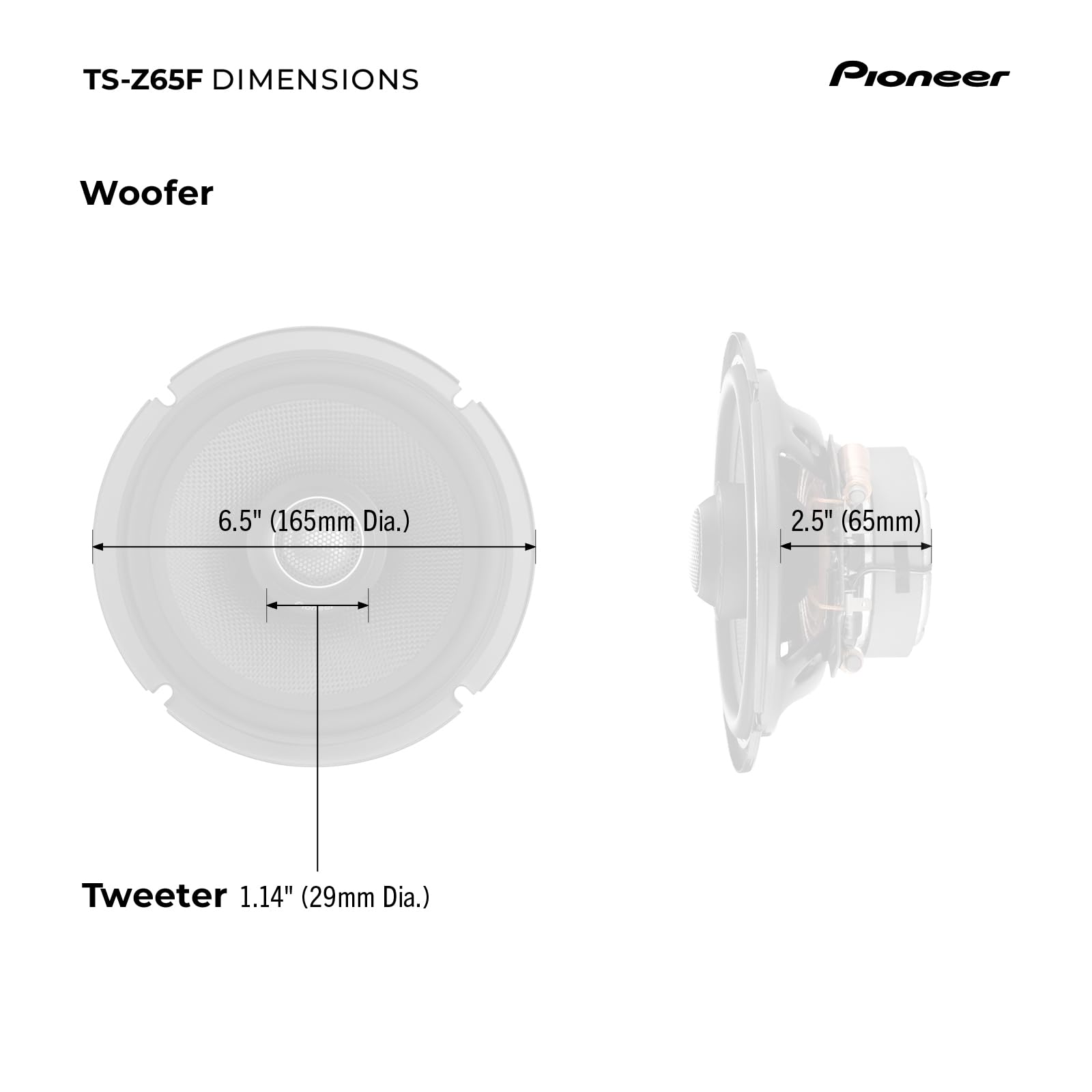 Elevate your in-car audio experience with the Pioneer TS-Z65F 2-Way Coaxial Car Audio Speakers. Crafted as part of the Z-Series, these speakers are meticulously engineered to deliver an unparalleled level of audio clarity, precision, and complexity, immersing you in a sound quality that closely replicates the original performance. These speakers don't just sound great; they pack a powerful punch too. With a maximum power handling capacity of 330 watts and a continuous power handling of 110 watts, the Z-series component speakers deliver dynamic sound with crisp highs and deep lows, providing a wide range of frequencies with utmost clarity and accuracy. Boasting an extensive frequency response range, experience a rich and immersive sound reproduction across various music genres. Moreover, with an 85 dB sensitivity rating, these speakers can produce clear and loud sound even when subjected to lower power inputs, allowing you to enjoy your music at high volumes without worrying about distortion. These speakers are a popular choice for many car models. Included with the coaxial system are original equipment (OE) 6-1/2” custom-fit installation brackets that optimize fitment in applicable speaker locations for improved acoustic performance. With the integrated/in-line crossover network, you increase installation flexibility without the need of an outboard module. Replacing your factory speakers has never been easier. Upgrade your car's audio system with the Pioneer TS-Z65F 2-Way Coaxial Car Speakers. Experience improved sound quality, enhanced bass, and clear vocals, bringing your music to life on the road. Enjoy the Pioneer quality and elevate your in-car audio experience.